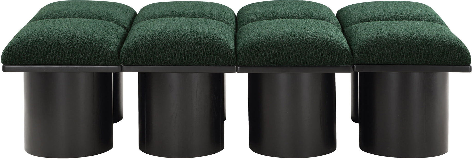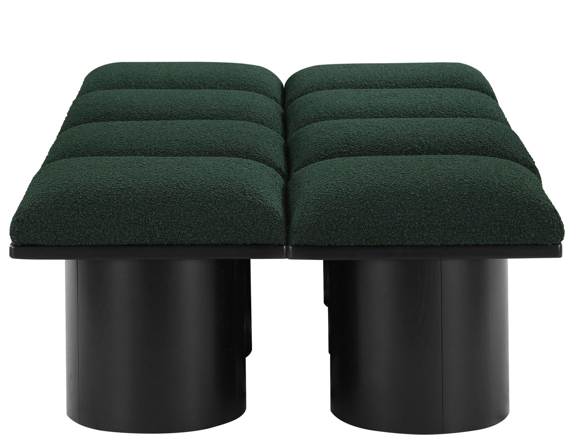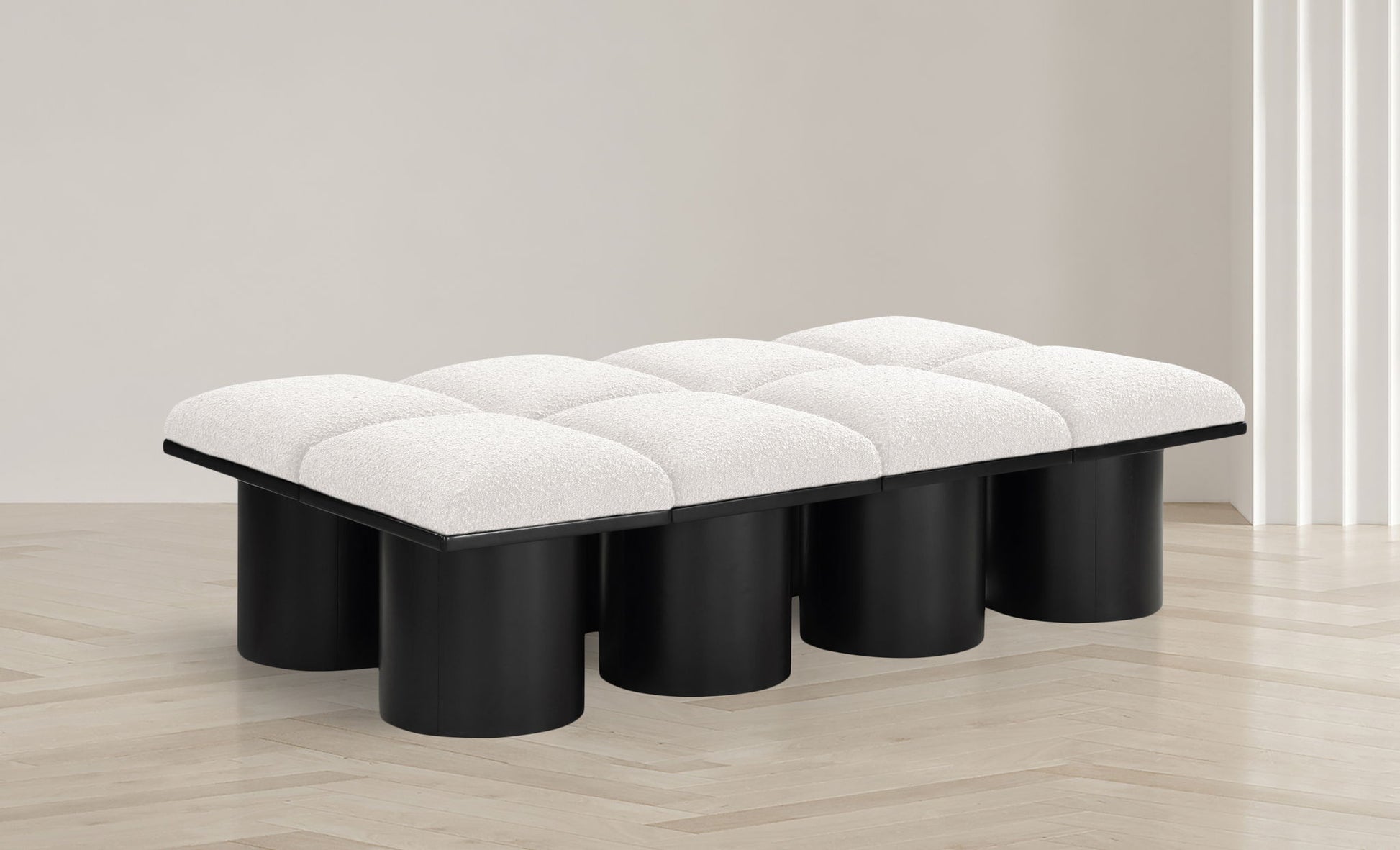 Bring valuable seating and remarkable style to your space with this Pavilion Boucle Fabric Bench, an exquisite balance of style and usability for the entryway, bedroom, and beyond. Crafted from oak veneer with a black finish, this bench has a 4-inch-thick seat cushion that's channel-tufted for a touch of luxury. The bench's columnar bases add a dash of Art Deco design, making it a captivating focal point in any room.