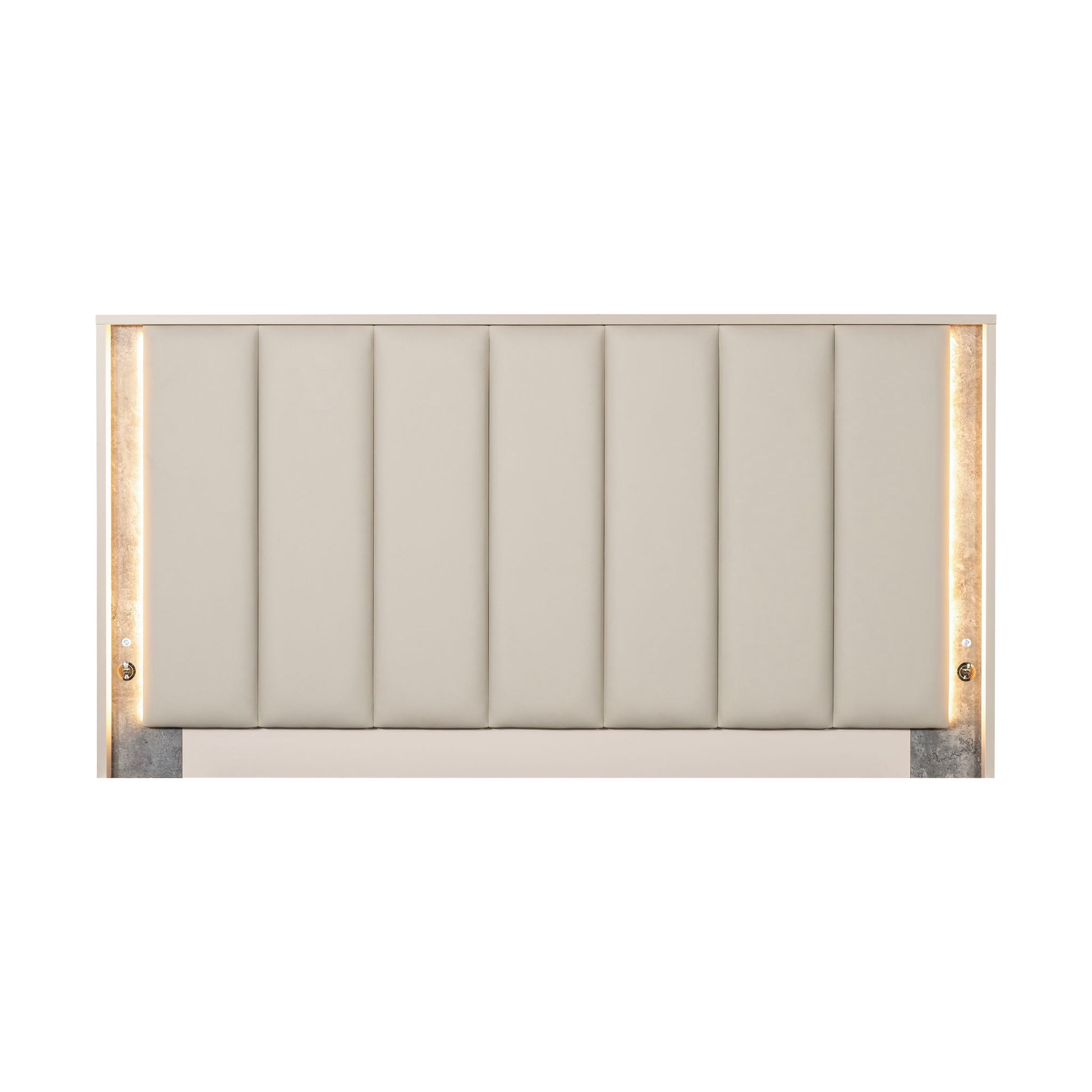 The Pavira Bed brings an understated grandeur to the room, pairing sculptural simplicity with the soft radiance of stone-inspired finishes. Its channel-tufted headboard, wrapped in smooth taupe upholstery, rises with tailored elegance, framed by luminous limestone-like inlays that glow gently at a touch. Thoughtfully integrated lighting and modern conveniences transform the bed into a serene retreat—an effortless blend of contemporary sophistication and quiet luxury.
