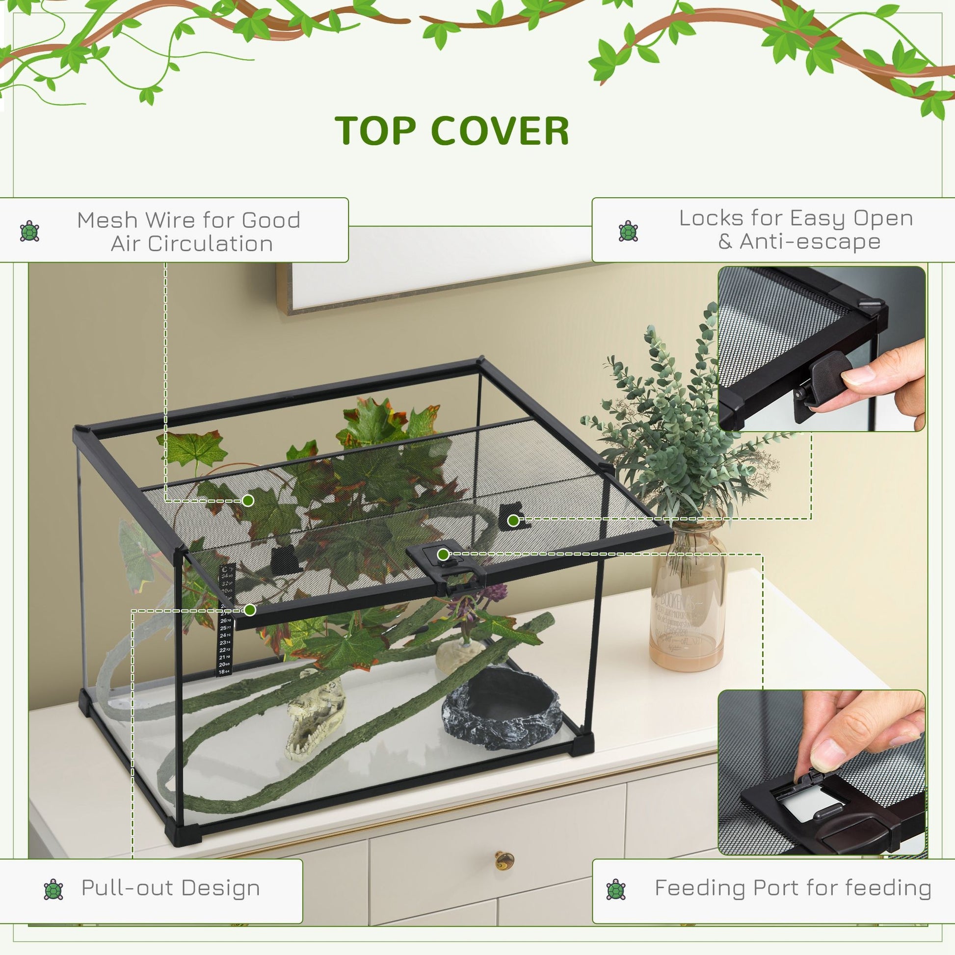 - Reptile Terrarium Info: Dimension of 19.75"W x 11.75"D x 13.75"H, no installation required, suitable for various reptiles.