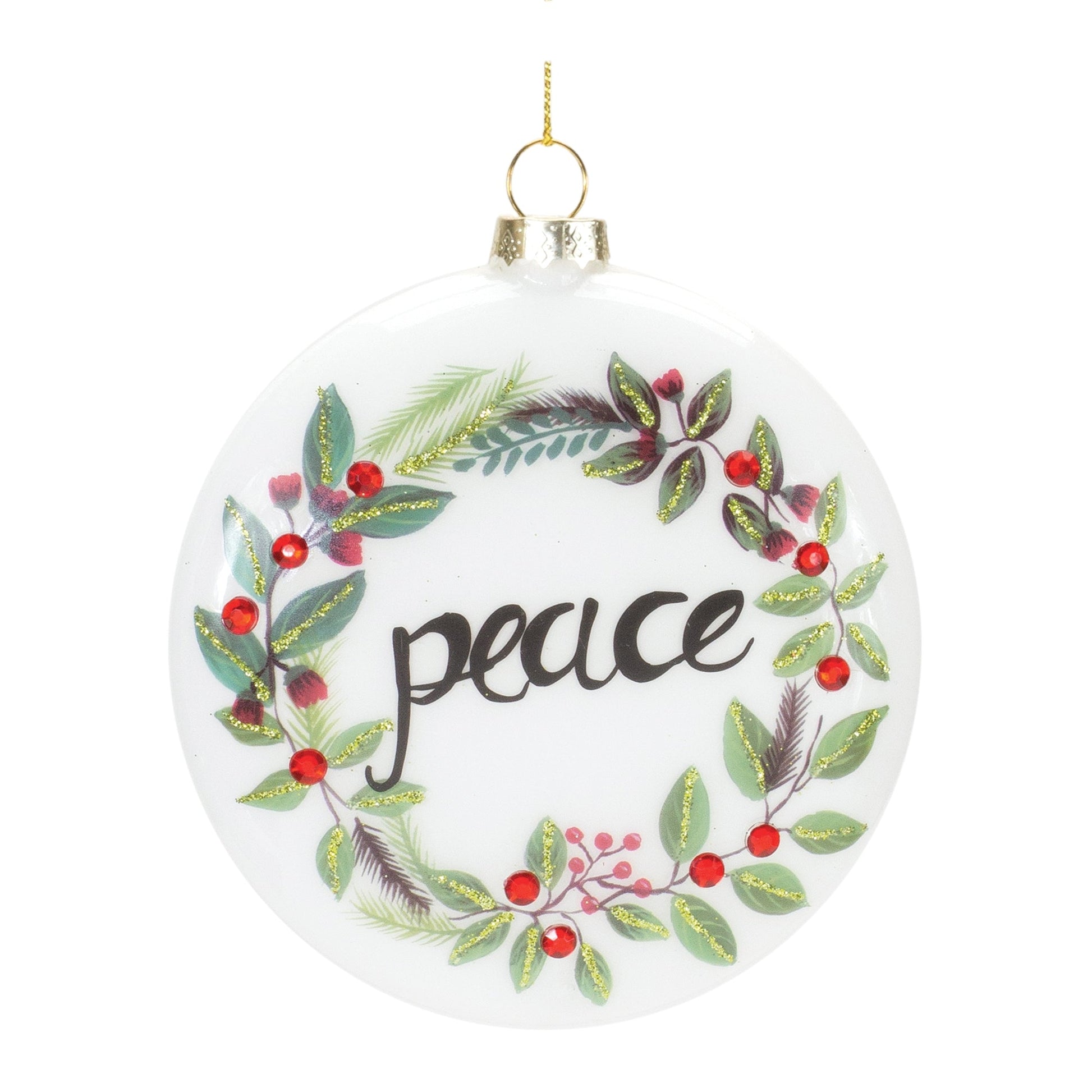 Adorn your Christmas tree and holiday decor with this stunning set of Peace and Noel Wreath Disc Ornaments. Featuring 12 pieces, the festive red and earthy green tones paired with the handpainted NOEL and PEACE with holly berry wreath design is the perfect combination to create a memorable display. The quality glass composition and delicate gold string hanging accent is sure to endure for seasons to come. Whether you're adding a touch of cheer to your home or gifting to a loved one, these ornaments will definitely bring smiles.
