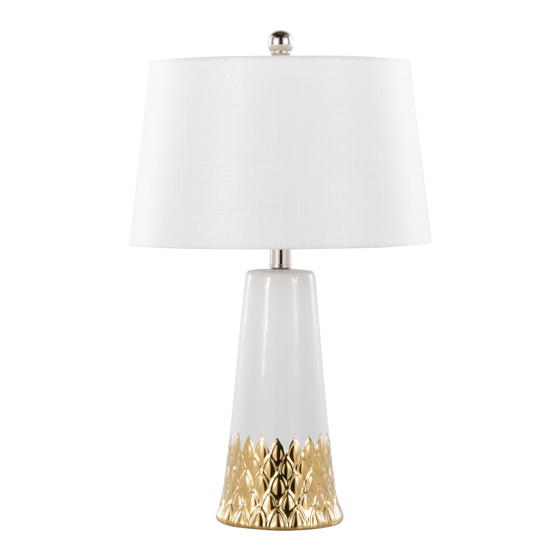 - Ceramic base with a white and gold finish