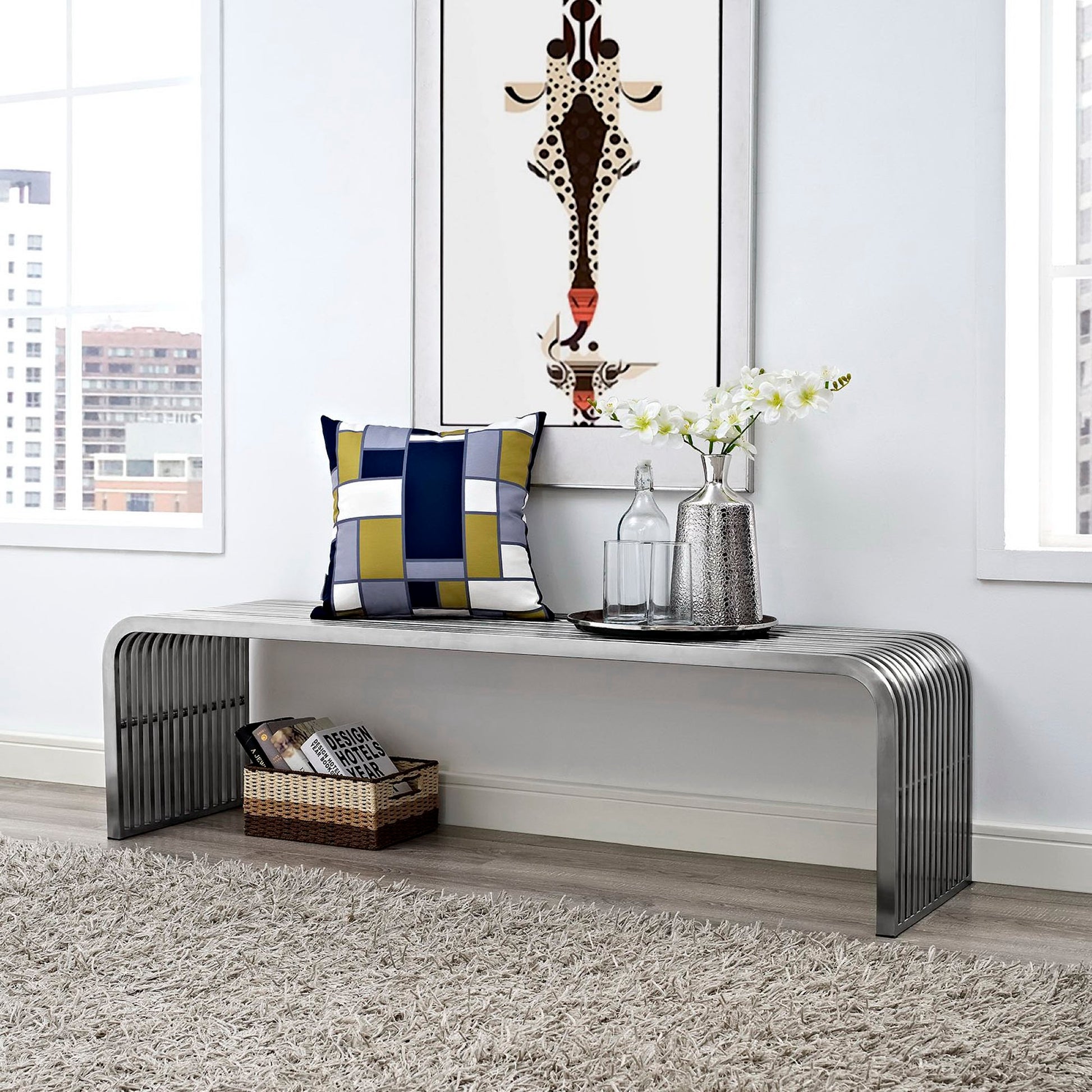 Expedite your d�cor with the Pipe Bench. Intended to convey the fluidity of progress, Pipe is comprised of fourteen continuous polished steel tubes with a side beam for support. Not one of equivocating, Pipe is a decisively modern piece that works well in contemporary living rooms, bedrooms, lounge spaces, and hallway areas.