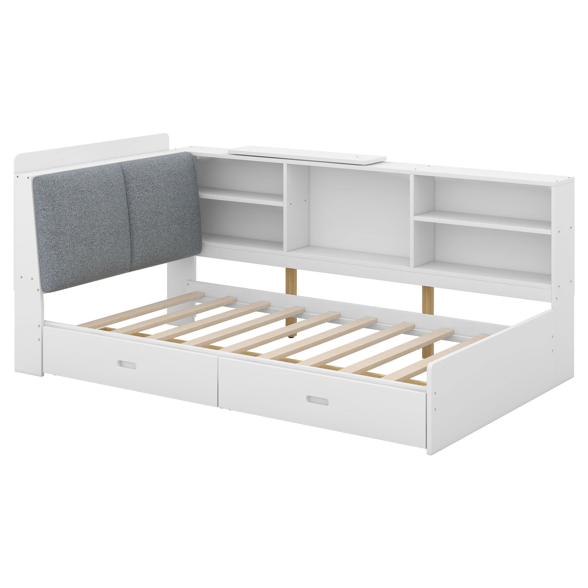 Twin Size Platform Bed With Storage Headboard, Shelves And 2 Drawers - White