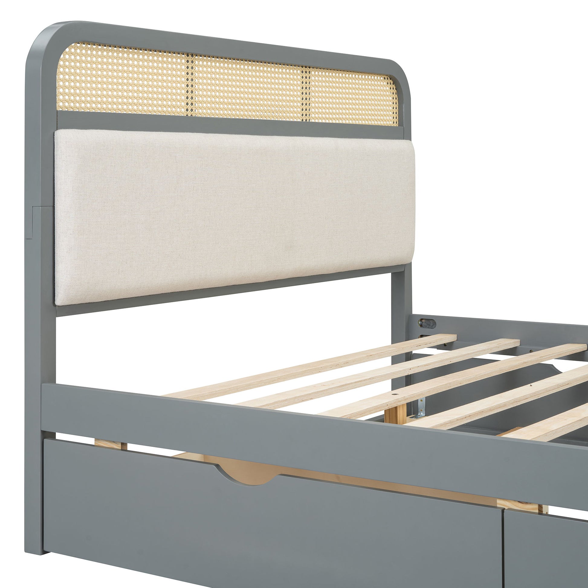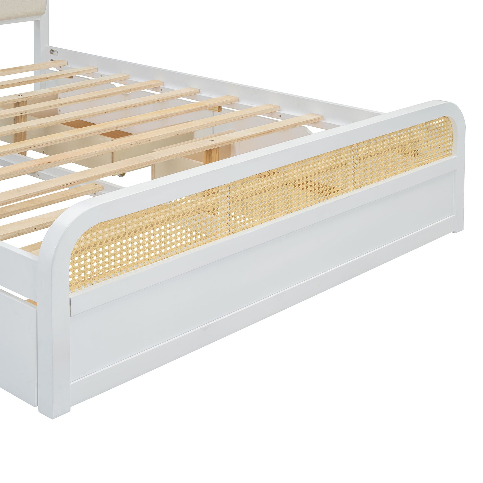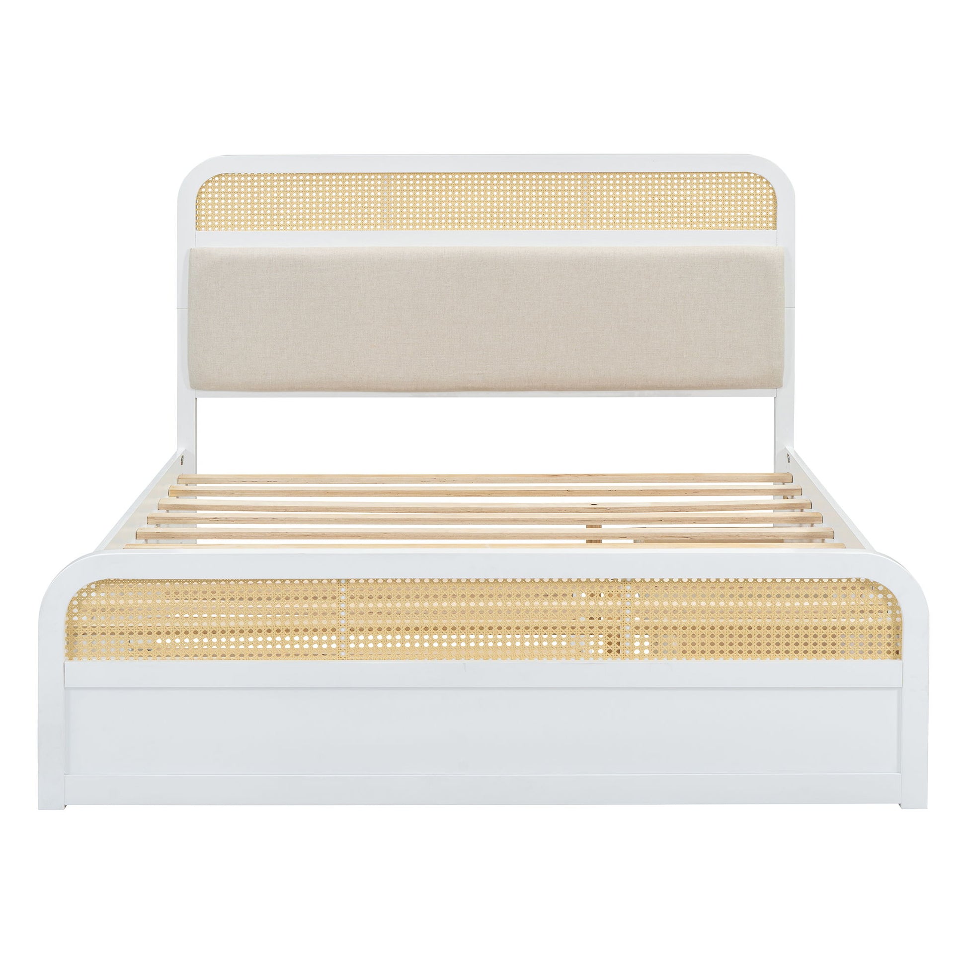 With tasteful rattan accents on both the headboard and footboard, this platform bed adds a touch of classic charm and sophistication to any decor, making it a stylish focal point in your home. The platform bed includes a twin-size trundle bed, which easily pulls out to accommodate overnight guests or provide additional sleeping space when needed. Equipped with two large drawers, this platform bed ensures ample storage for linens, pillows, and other essentials, helping you keep your space organized and clutter-free. The headboard comes with a plush, padded cushion, providing you with a cozy spot to lean back and relax whether you’re reading or unwinding.