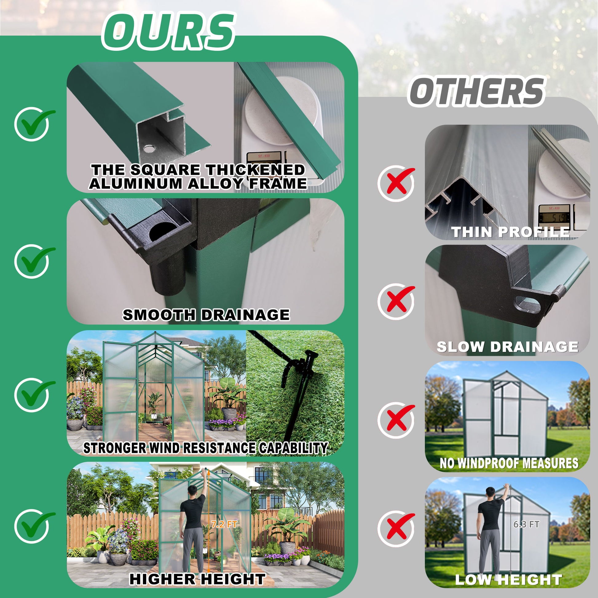 - Heavy-duty & Durable Frame: The 4mm thick polycarbonate board withstands temperatures from -20℃ to 70℃, allowing up to 70% light transmission and blocking over 99.9% of harmful UV rays. The aluminum alloy frame with powder coating ensures rust resistance and durability.