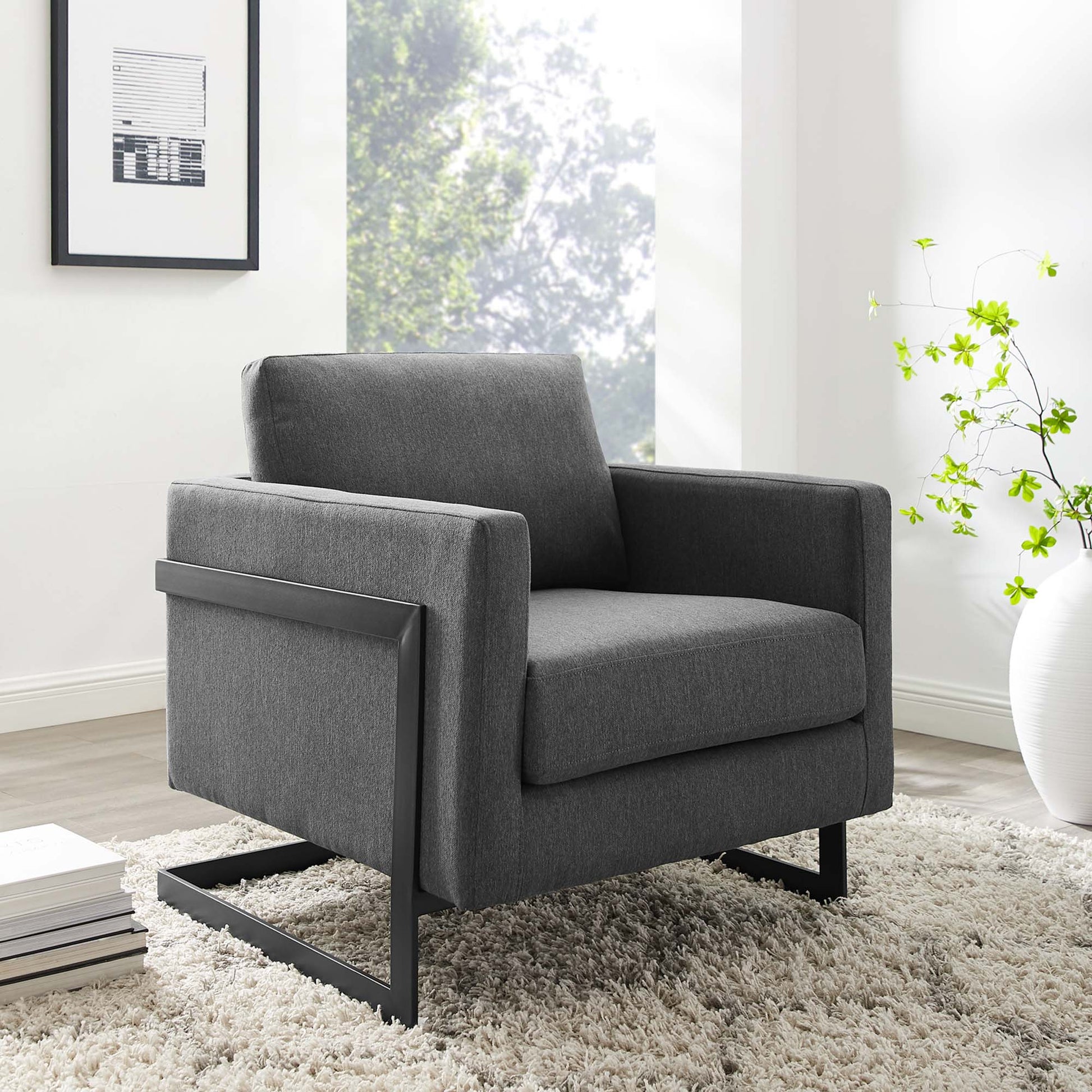 Welcome rich luxury and glam deco style to your living space with the Posse Fabric Upholstered Accent Chair. A striking addition to the living room, office, bedroom, or entryway, this armchair sits atop a matte black stainless steel sled base complete with squared edges and angular detail. Covered in soft, polyester fabric, this upholstered armchair features dense foam padding over no-sag springs for a premium seating experience abounding in comfort and support. This fabric chair is perfect for offices looking to impress new clients and for anyone intrigued by retro modern designs that develop space and form in an innovative way. Includes non-marking foot pins. Assembly Not Required. Weight Capacity: 300 lbs.