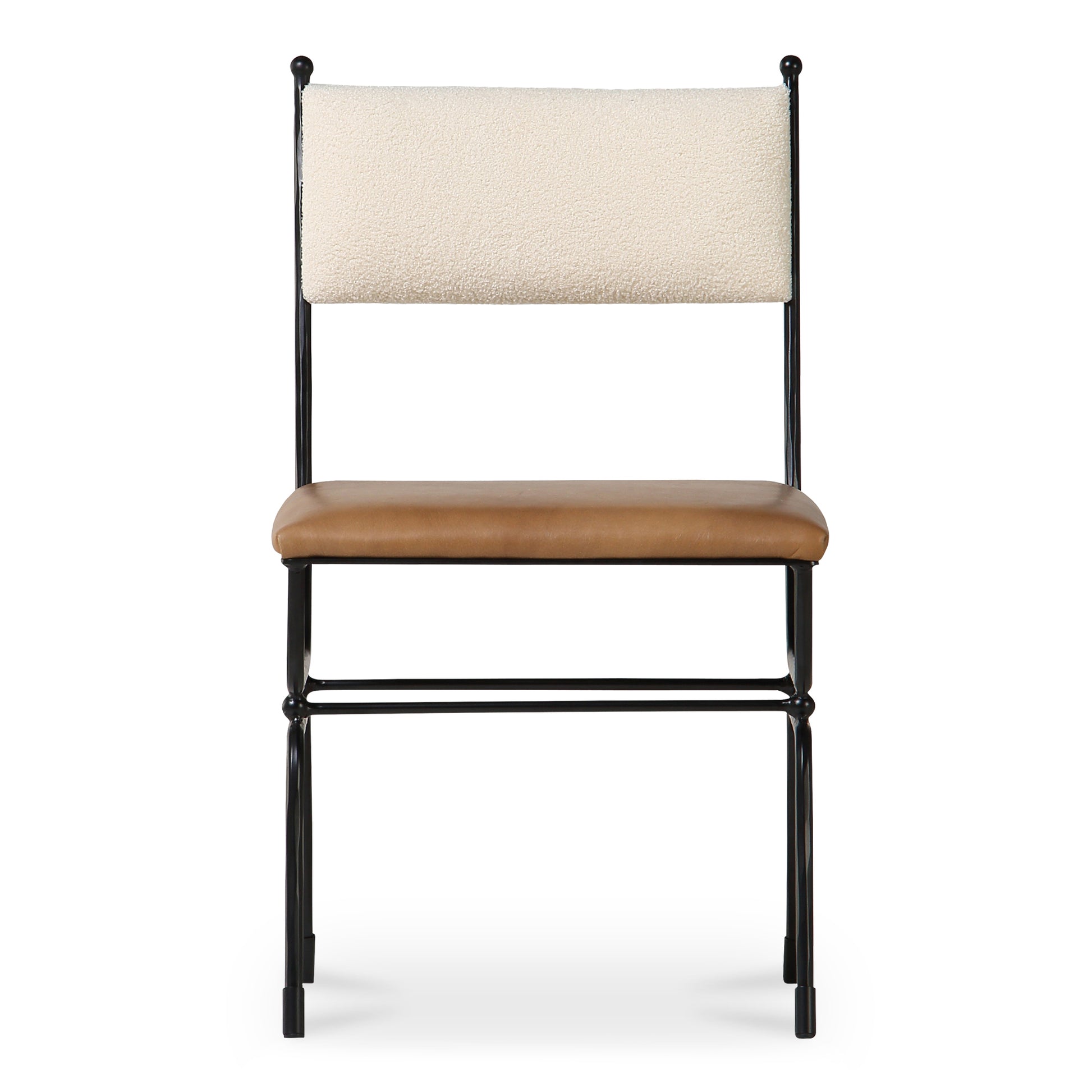 The Posta dining chair is inspired by the historical elegance of Italy's Posta Vecchia hotel, seamlessly marrying vintage allure with modern comfort. Its robust hammered metal frame underscores distinctive finial details on the back and base, echoing the Italian locale's enchanting spirit. Upholstered with top-grain brown leather seat and white textured fabric back, this piece adds plush comfort with a touch of Italian finesse.