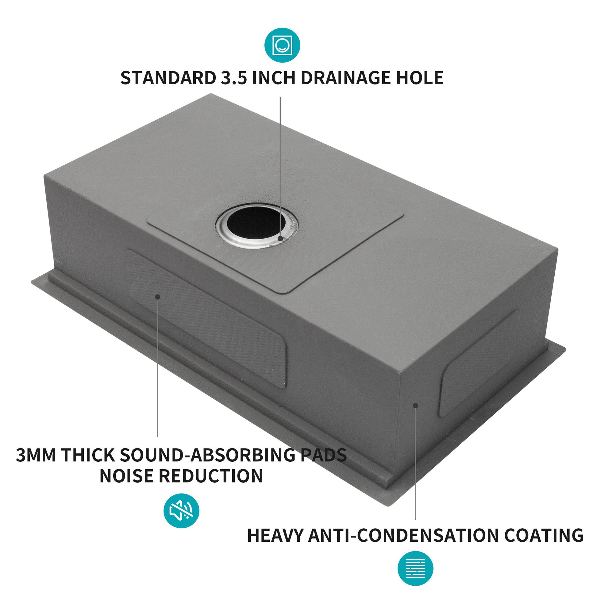 - Dimensions: Exterior 33" x 19" x 10", fits most 36" cabinets, with a standard 3-1/2" drain opening.