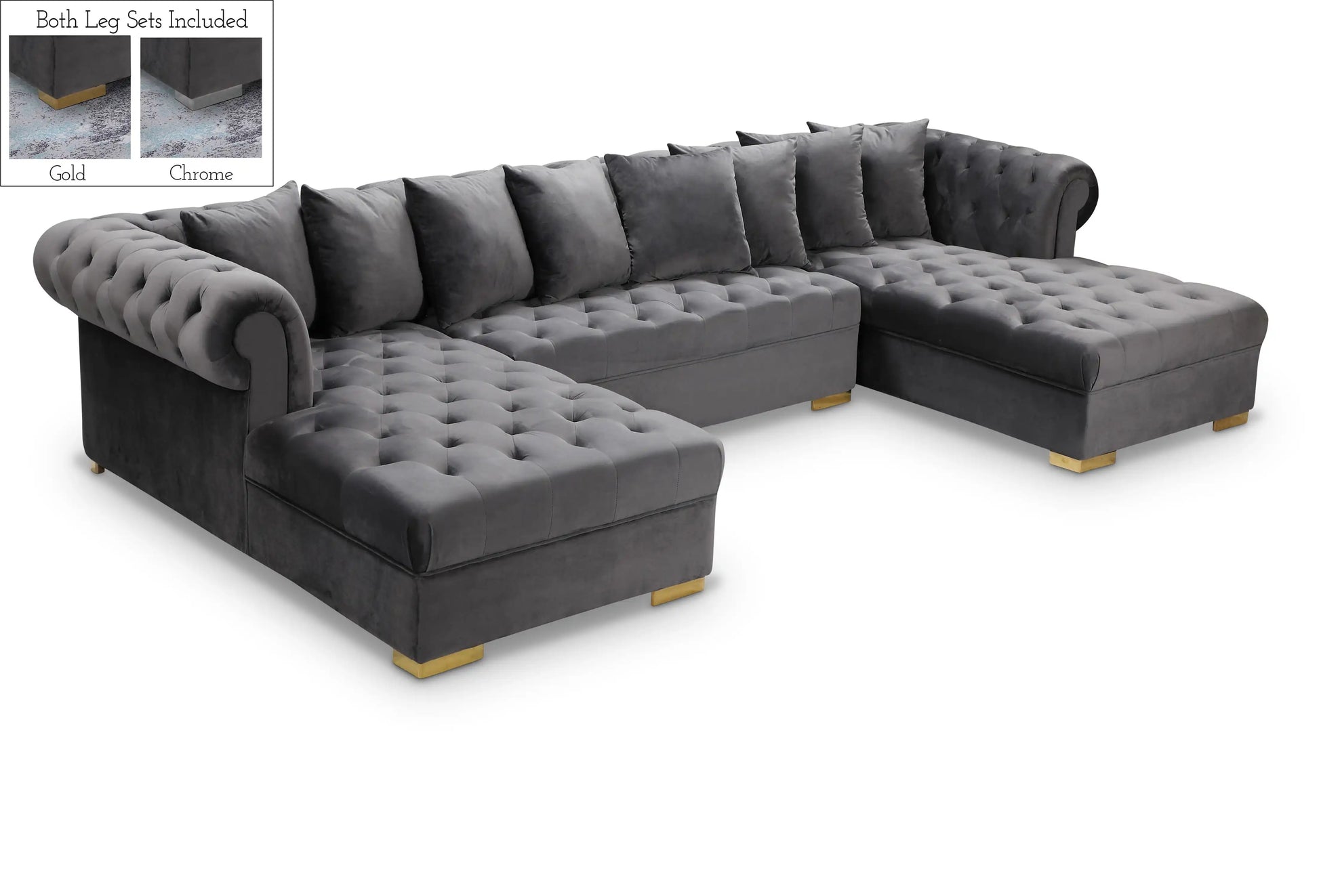 Get ready to relax after a long day with this Presley Sectional from Meridian Furniture. Featuring rich velvet upholstery with deep tufting and comfy pillows, this double chaise sectional provides a luxurious, cozy space to kick back and watch TV, take a nap, or curl up with a nice book. Complete sets of and legs complement your contemporary home decor while providing solid support for the sectional's frame.