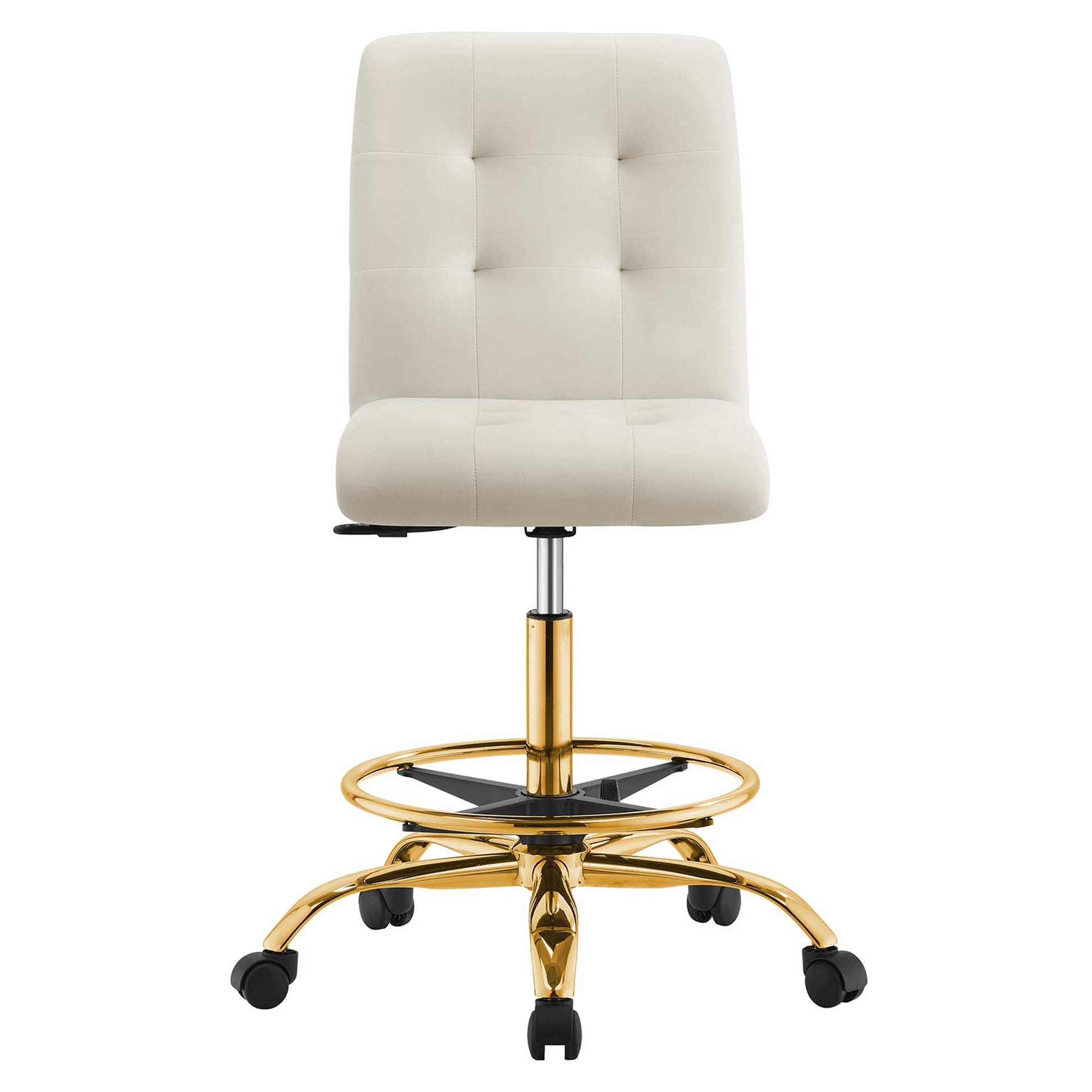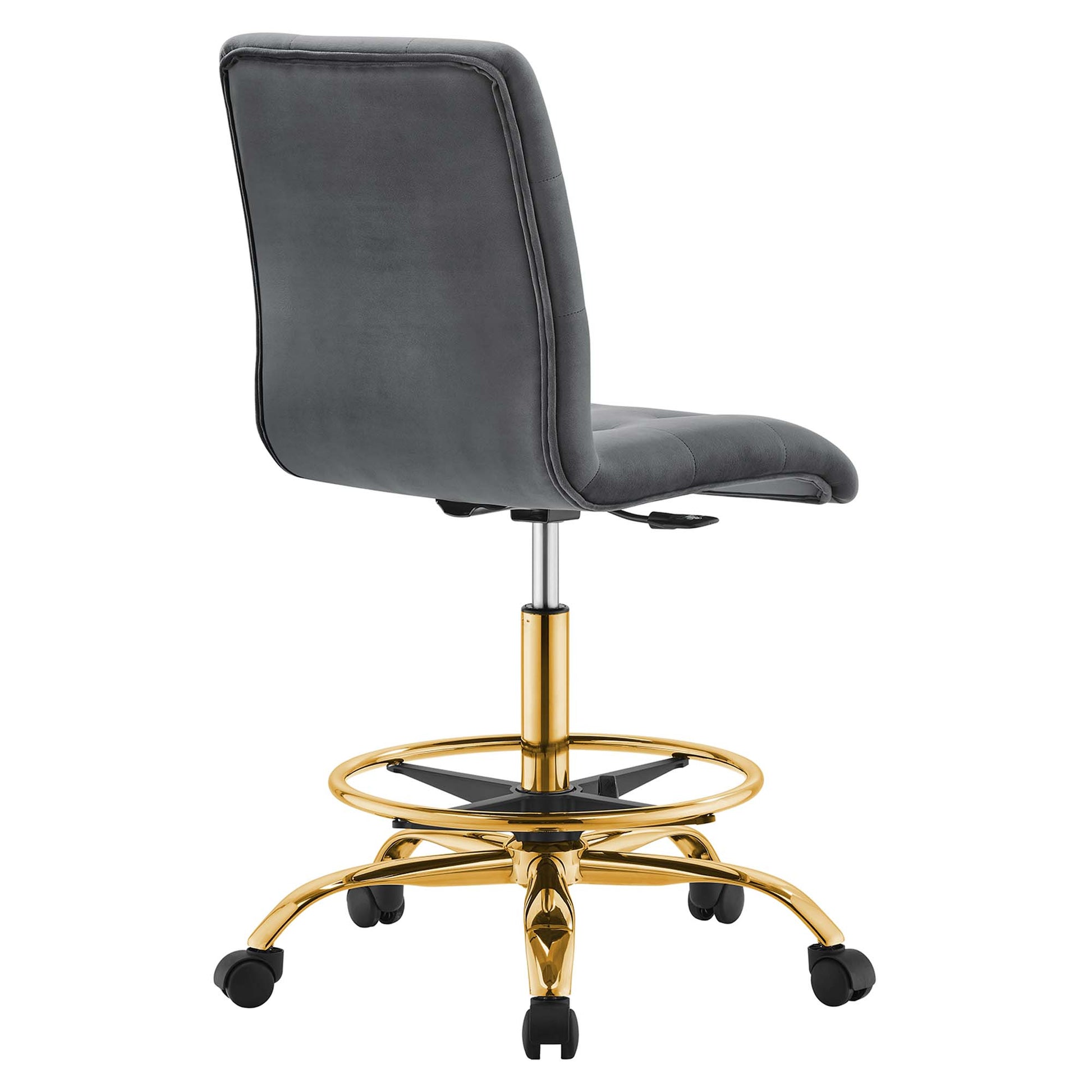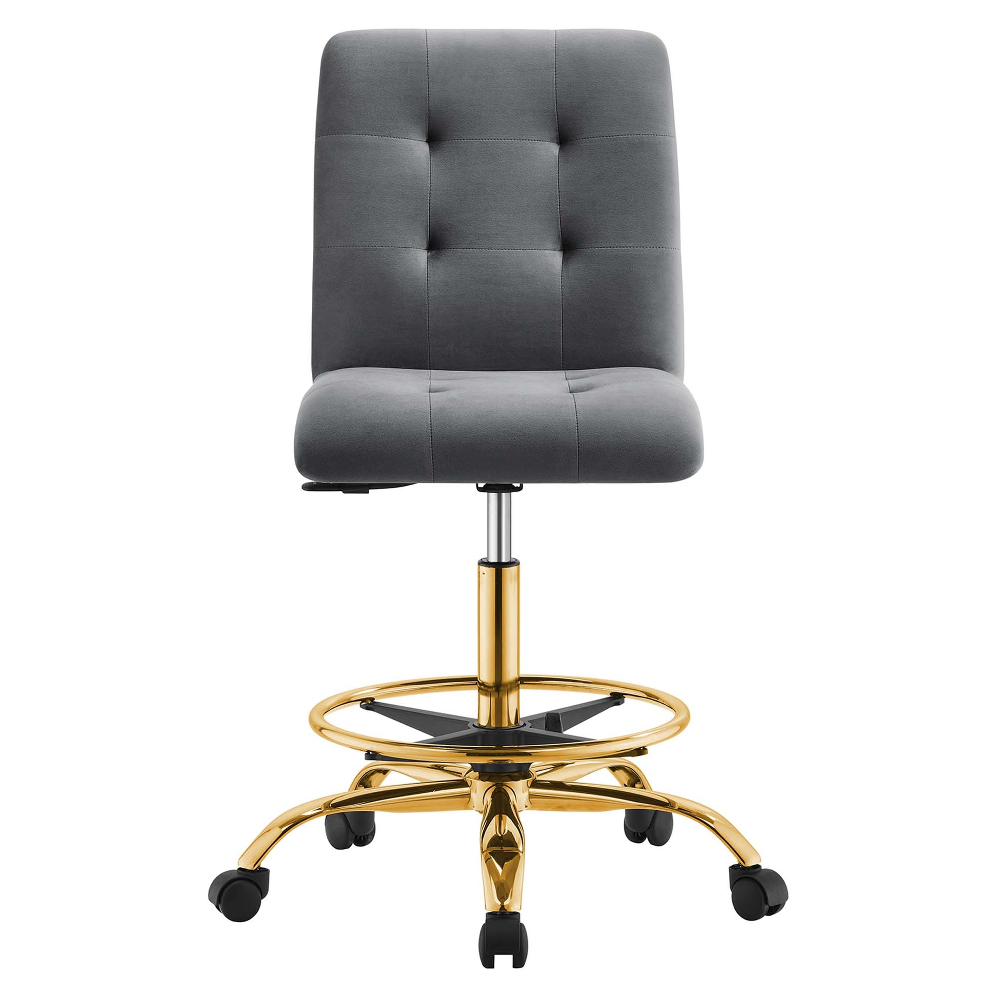 Etiquette presides over the properly styled Prim Armless Drafting Chair. Modern and luxurious, this swivel drafting stool features deep biscuit tufting, stain-resistant performance velvet upholstery, and elegant piped trim for added finesse. This velvet drafting-height office chair is height adjustable, features a 360� swivel, and comes outfitted with a gold metal base with five dual-wheel nylon casters. Perfect for standing desks, drafting tables, reception desks, and more, Prim is complete with dense foam padding for lasting comfort throughout the workday. Assembly required. Weight Capacity: 287 lbs.