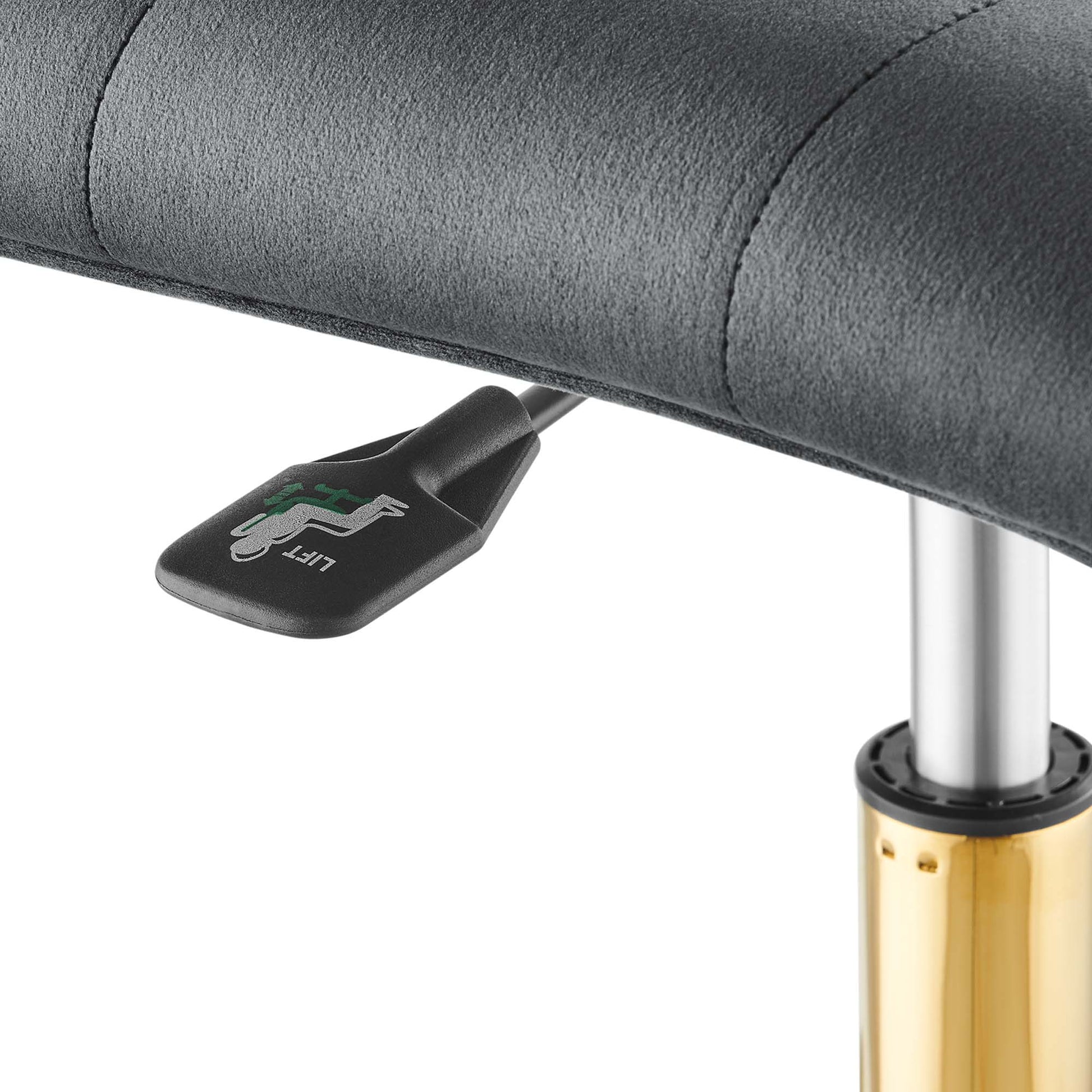 Etiquette presides over the properly styled Prim Armless Office Chair. Modern and luxurious, this swivel office chair features deep biscuit tufting, stain-resistant performance velvet upholstery, and elegant piped trim for added finesse. This velvet office chair is height adjustable, features a 360� swivel, and comes outfitted with a gold metal base with five dual-wheel nylon casters. Perfect for conference rooms, workstations, desks, or college dorm rooms, Prim is complete with dense foam padding for lasting comfort throughout the workday. Assembly required. Weight Capacity: 287 lbs.