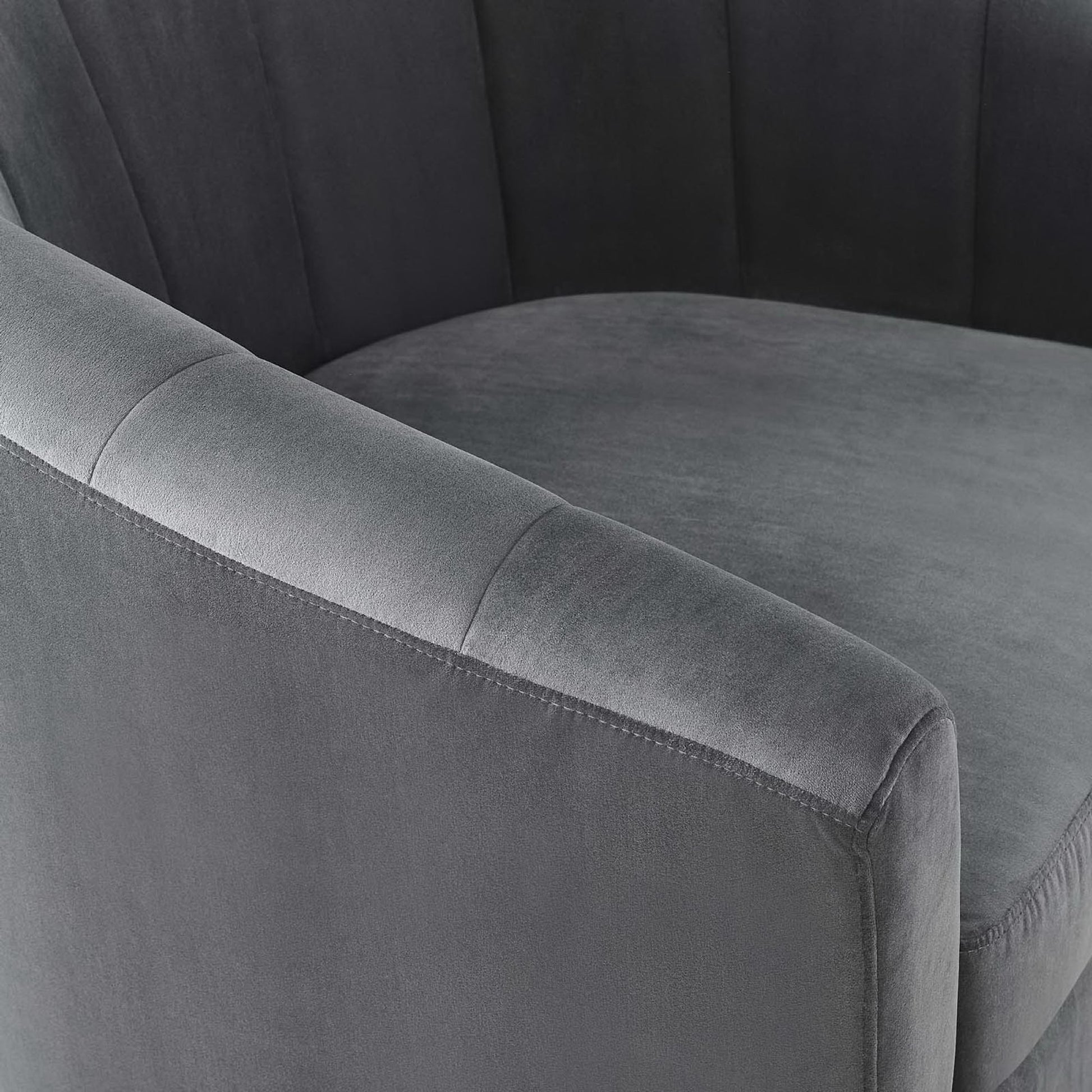 A fresh outlook on a familiar classic, the Prospect Performance Velvet Swivel Armchair brings intrinsic luxury to your living space. This barrel back armchair comes upholstered in stain-resistant performance velvet fabric and boasts channel tufted accents, updating the Chesterfield-inspired profile with retro modern design elements. The densely padded removable seat and backrest grant approachable comfort that beckons guests to sit and stay a while. Solidly constructed from wood and plywood, this accent chair rests securely on a sturdy swivel base. Assembly Required. Maximum Weight Capacity: 331 lbs.