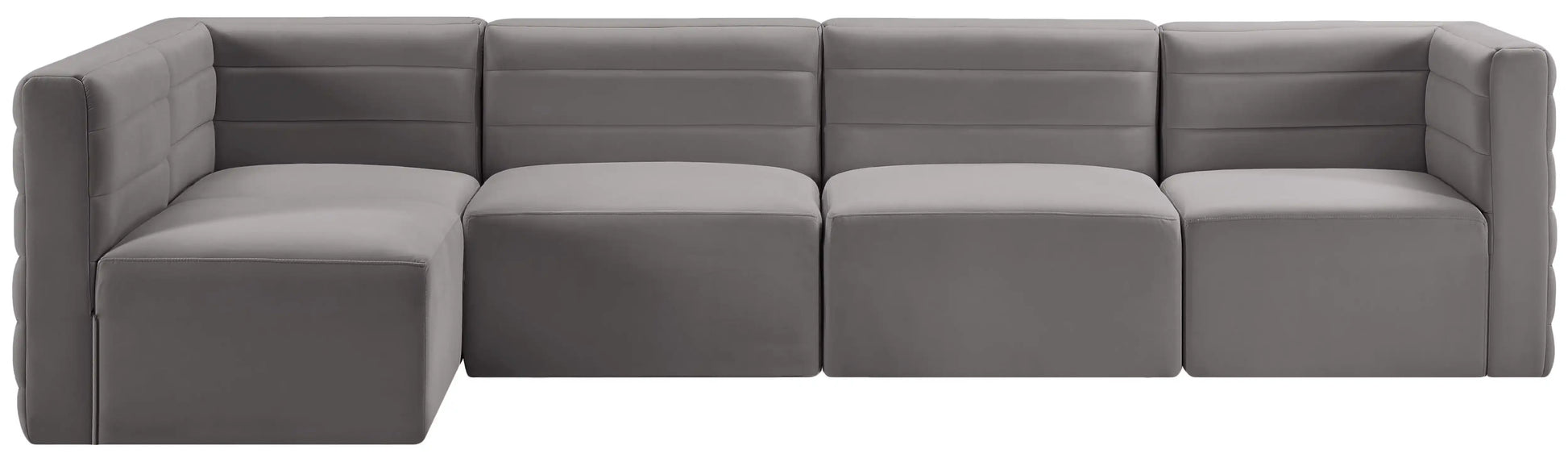 Show them all that less is more with the minimalist look of this Quincy velvet cloud-like comfort modular sectional. This elegant chair features a simple design that's all about comfort and modern style. The soft velvet upholstery is sleek to the touch, and the back of the unit features deep horizontal channel tufting for a look that wows. Because this is a modular seating option, you can pair it easily with other items in the Quincy collection to create a look you love. Latches underneath make it easy to mix and match items from the collection.
