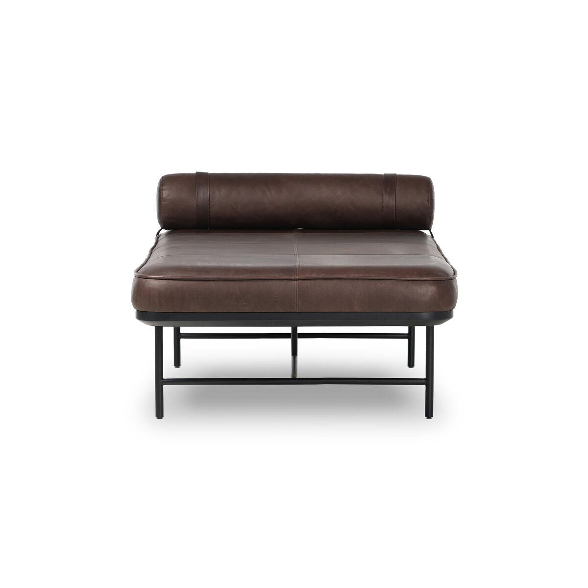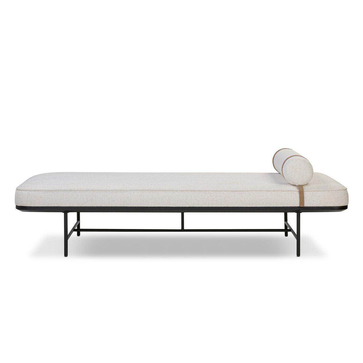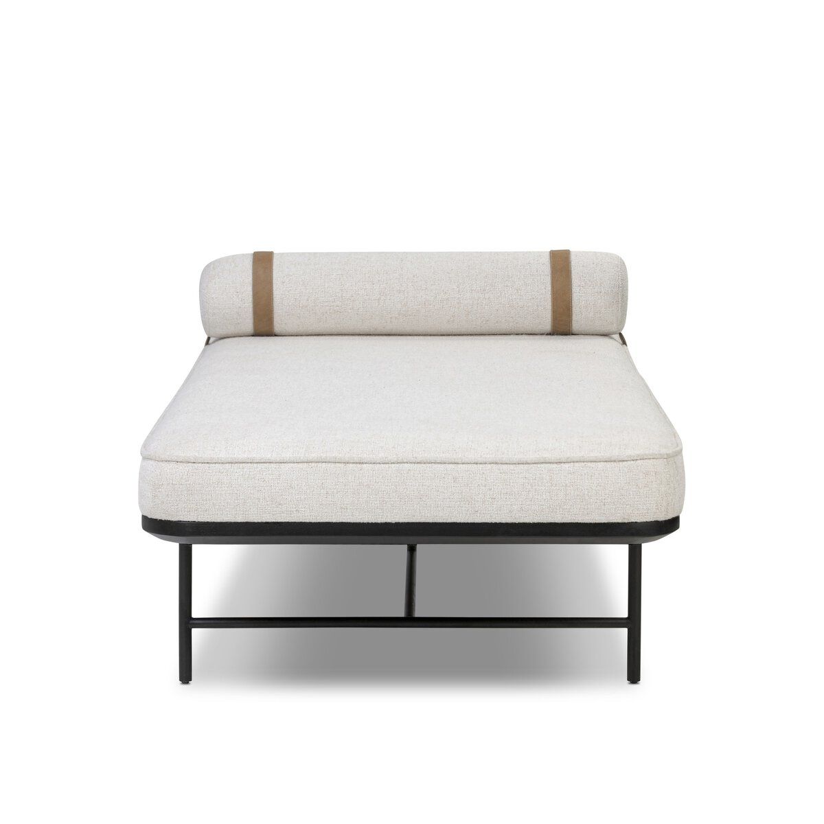 A strap-secured bolster headrest enhances both comfort and visual appeal, while slim steel legs lift the form for a light, airy presence. Thoughtful proportions and tailored details make this chaise an elegant accent for living rooms, bedrooms, or reading spaces, balancing softness with a distinctly contemporary edge.