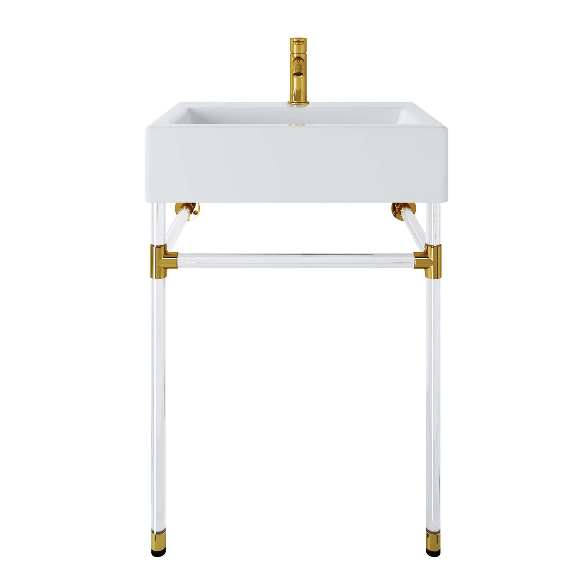 Create a bathroom oasis with the minimalist style and efficiency of the Redeem Wall-Mount Acrylic Bathroom Vanity. The glossy white ceramic sink basin and streamlined acrylic frame affix directly and securely to the bathroom or powder room wall. Redeem dispenses gentility in spaces large and small, resting confidently on a sturdy acrylic frame with gold joints for added stability. This small bathroom vanity has a single faucet hole and is outfitted with non-marking foot caps to protect your bathroom floor. Assembly required and fixtures not included.