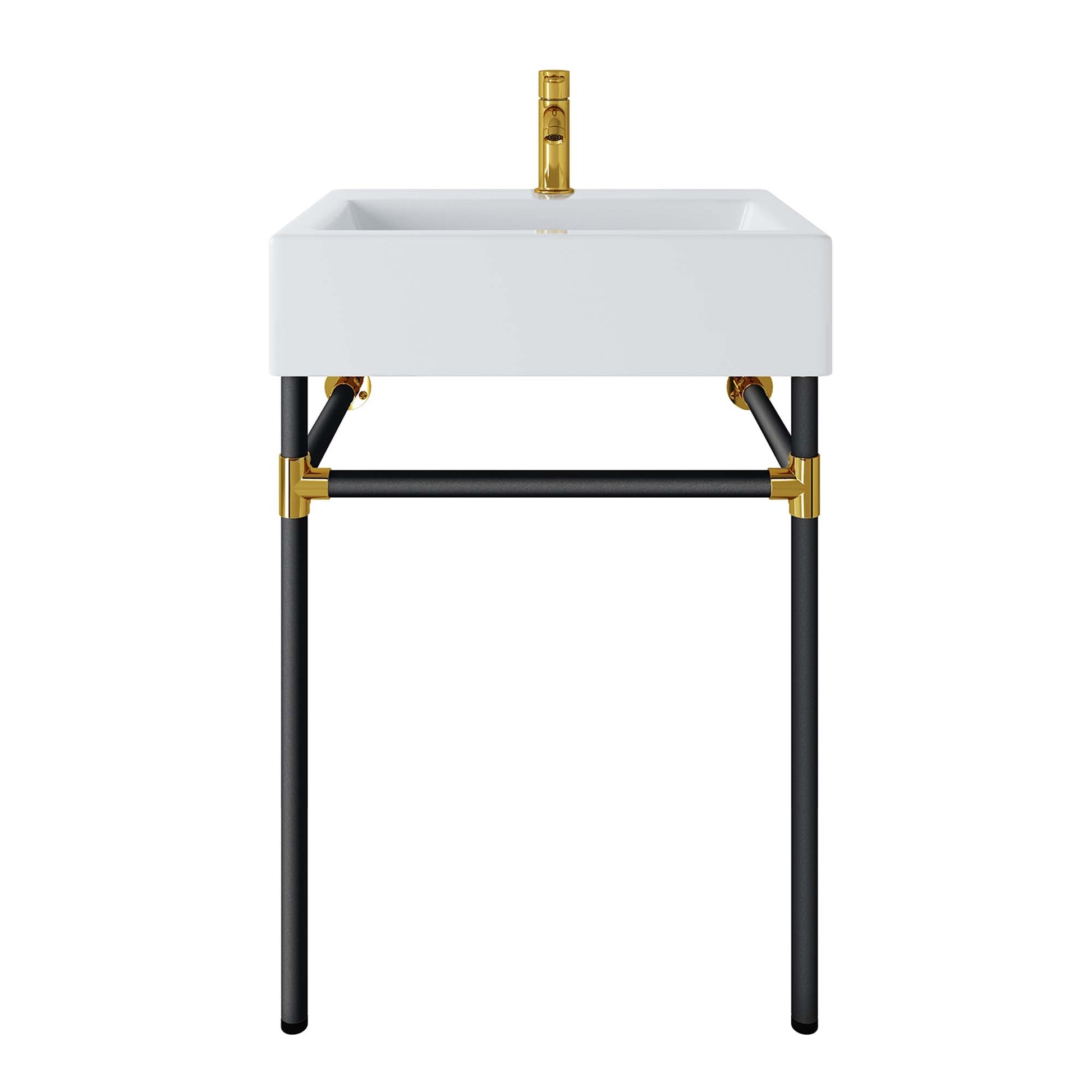 Create a bathroom oasis with the minimalist style and efficiency of the Redeem Wall-Mount Black Stainless Steel Bathroom Vanity. The glossy white ceramic basin and robust stainless steel frame affix directly and securely to the bathroom or powder room wall. Redeem dispenses gentility in spaces large and small, resting confidently on a sturdy black metal frame with gold joints for added stability. This small bathroom vanity has a single faucet hole and is outfitted with non-marking foot caps to protect your bathroom floor. Assembly required and fixtures not included.