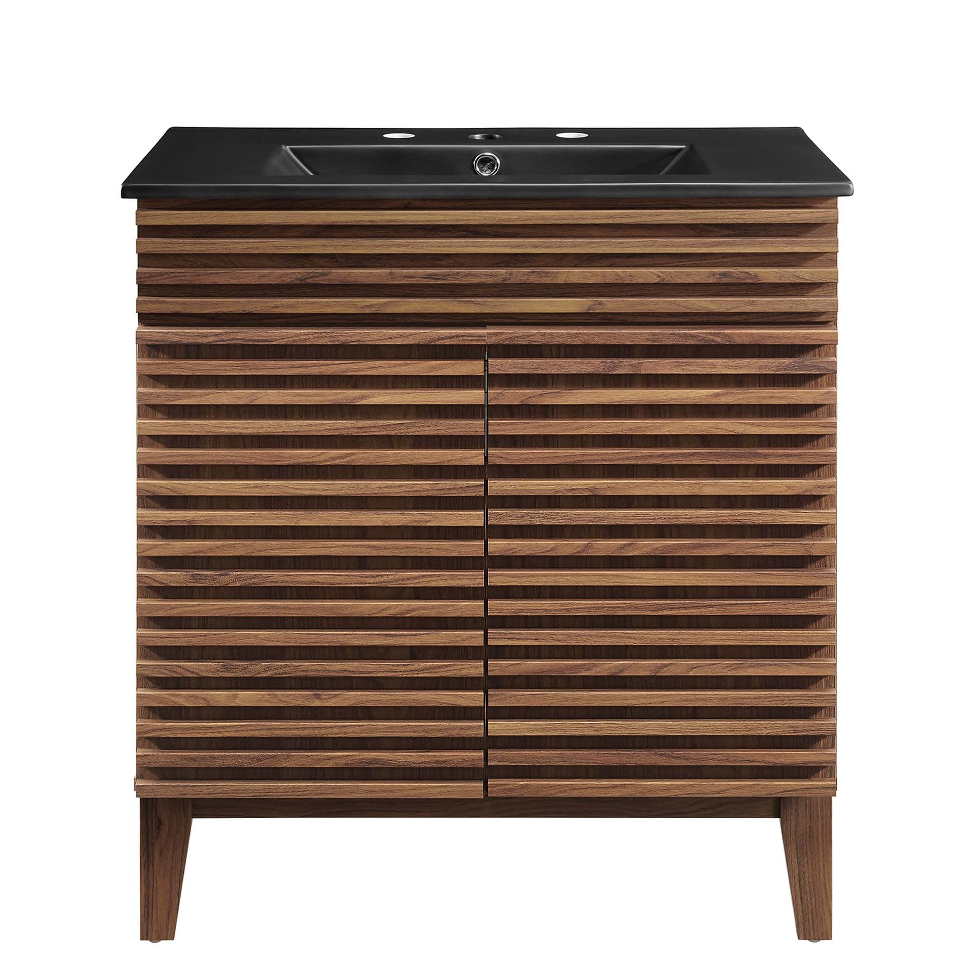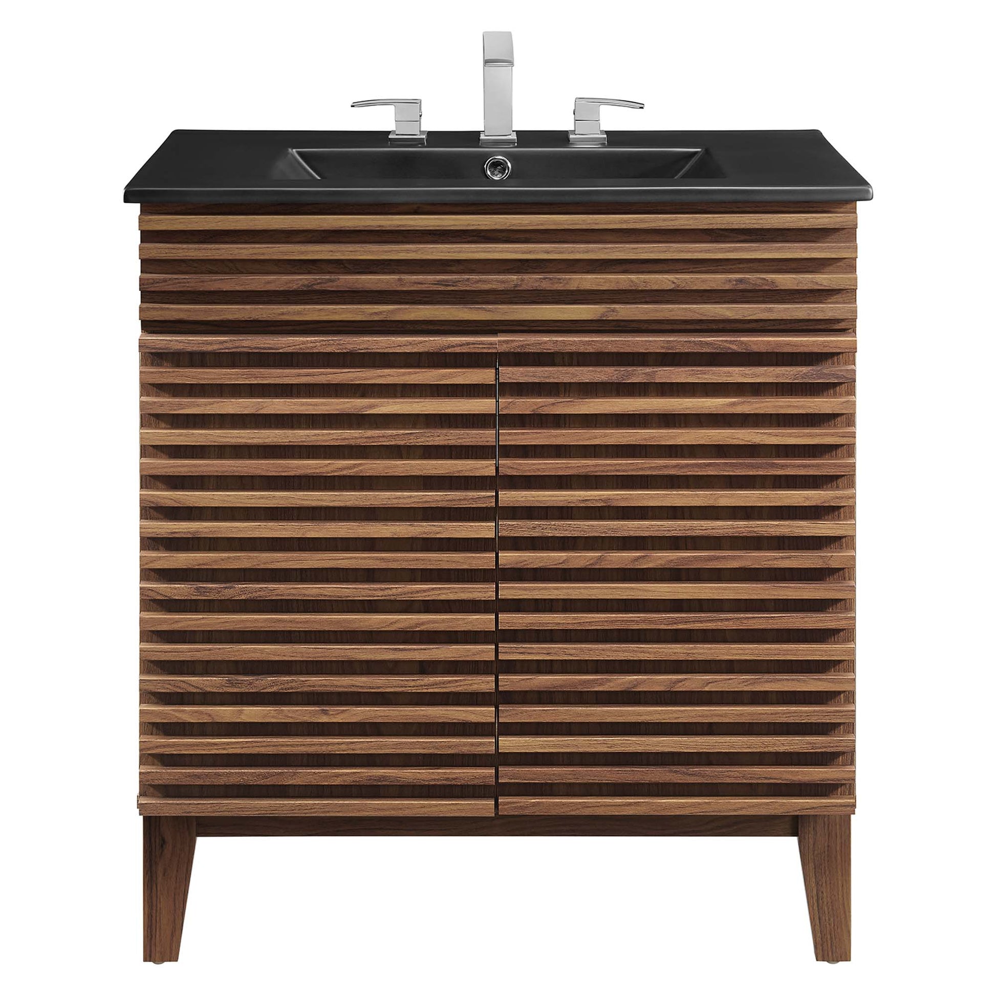 Tap into mid-century aesthetics with the Render Vanity. Render Bathroom Vanity features a durable particleboard frame with smooth laminate, four tapered wood legs, and adjustable storage shelf behind two soft-close hinged doors. A curved ceramic basin and integrated countertop with three faucet holes create sleek lines and crisp design for an edgy style designed to meet your needs. Boasting a mid-century modern style this vanity features a solid construction with a pleasing look and practical functionality. 8" widespread faucet holes. Assembly required and fixtures not included.
