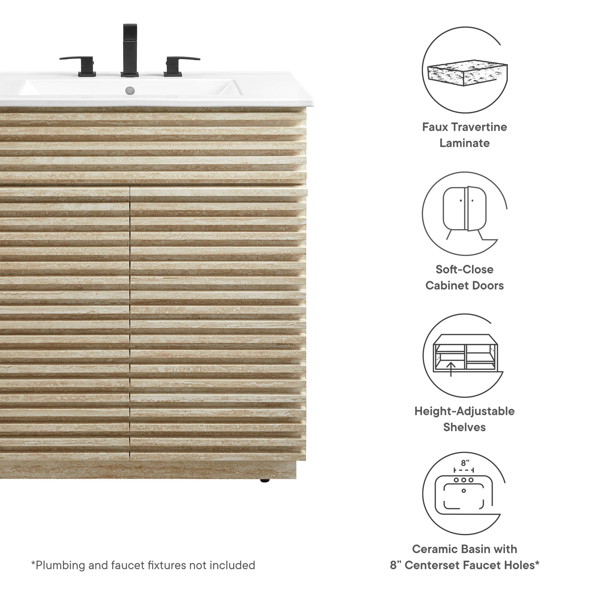 Tap into mid-century aesthetics with the Render Vanity. This slatted 30 inch bathroom vanity features a durable particleboard frame with smooth laminate and a sturdy plinth base. It includes an adjustable storage shelf behind two soft-close hinged doors, offering ample room for plumbing and storage. The ceramic basin and integrated countertop with three 8" widespread faucet holes create sleek lines and a crisp design for an edgy style that meets your needs. Boasting a mid-century modern style, this 30" bathroom vanity with sink combo features a solid construction with a pleasing look and practical functionality. Assembly required, and ready for fixtures of your choosing (not included).