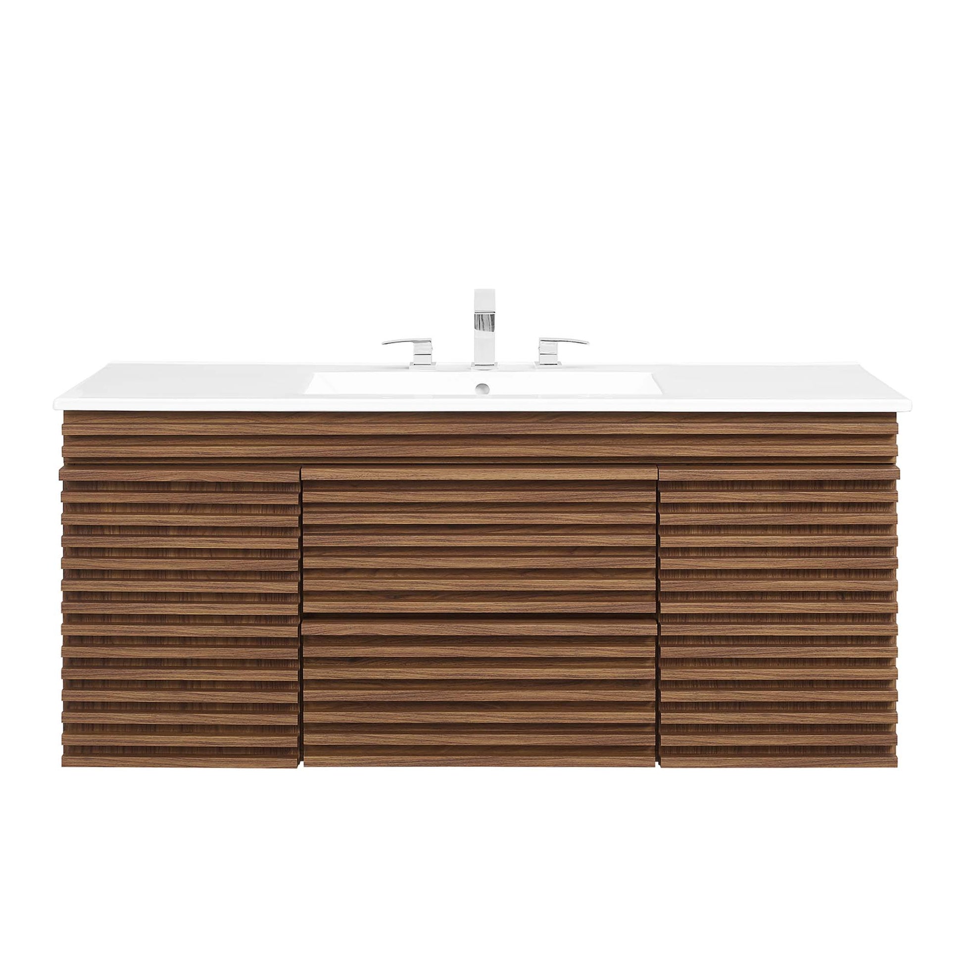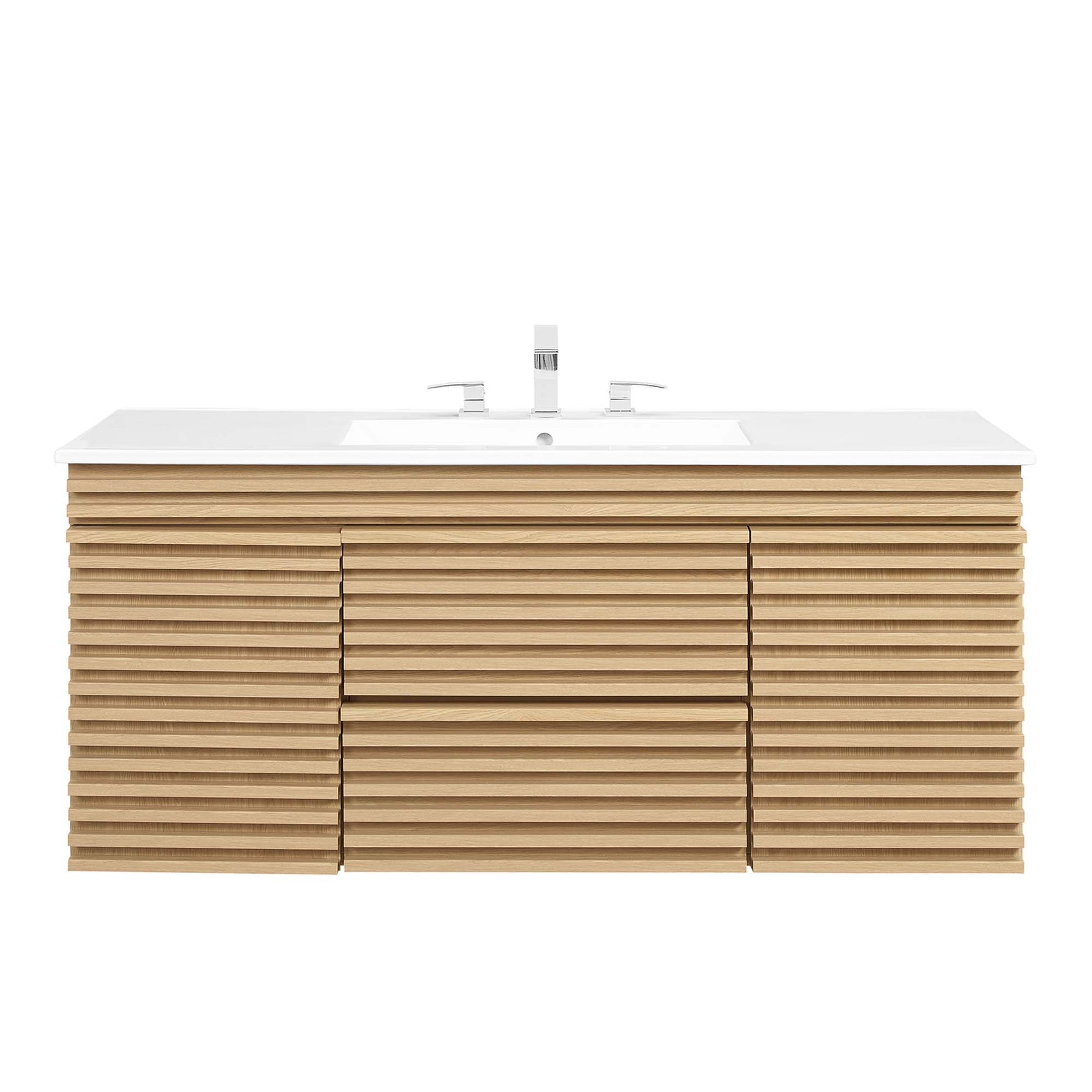 Tap into mid-century aesthetics with the Render Vanity. The Render 48" Single Sink Bathroom Vanity features a durable MDF and particleboard frame with a smooth laminate, ample storage space in two full-extension drawers, adjustable shelves behind soft-close hinged doors, and a space-saving wall-mount design. A curved ceramic basin with an integrated countertop and 8" widespread faucet holes creates sleek lines and a crisp design for an edgy look designed to meet your needs. Boasting a mid-century modern style this vanity features a solid construction with a pleasing look and practical functionality. Assembly required. Fixtures not included.