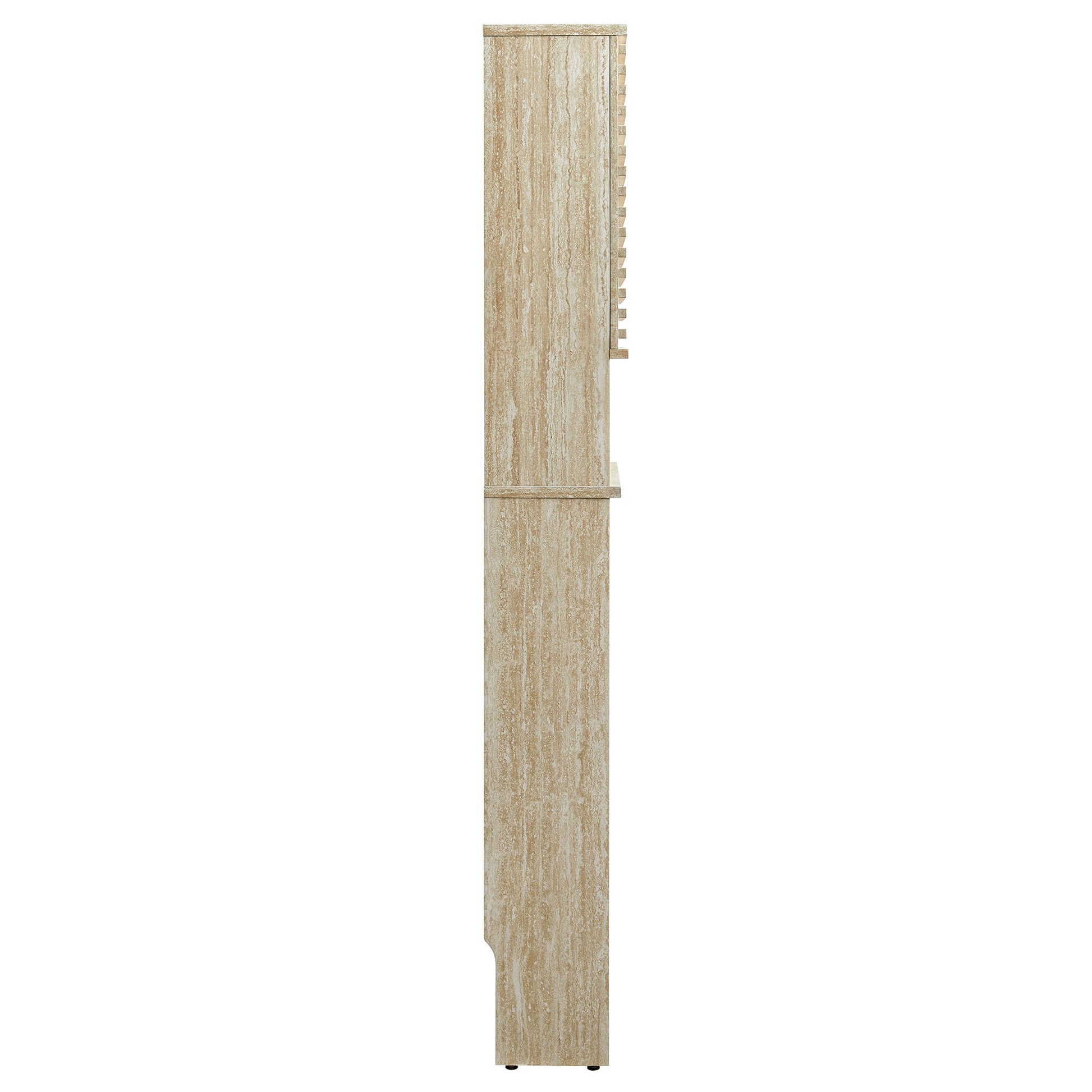 Tap into mid-century aesthetics with the Render Over the Toilet Storage Cabinet. This bathroom organizer over the toilet boasts one open shelf and a concealed storage area behind 2 soft-close hinged doors. Each door on the bathroom toilet cabinet displays beautifully designed slatted details, creating sleek lines and a crisp look designed to bring modernity to your bathroom space. These doors open to reveal adjustable shelves within, offering a tailored storage solution. Matching the doors' modern aesthetic, the rest of this over the toilet organizer with cabinet is just as thoughtfully designed, featuring a durable particleboard frame with faux travertine laminate. Abounding in mid-century modern style, this above toilet storage cabinet offers a solid construction with a pleasing look and practical functionality perfect for storing towels, linens, toilet paper, makeup, and other bathroom essentials. This toilet cabinet includes non-marking floor glides to protect flooring. Assembly required.