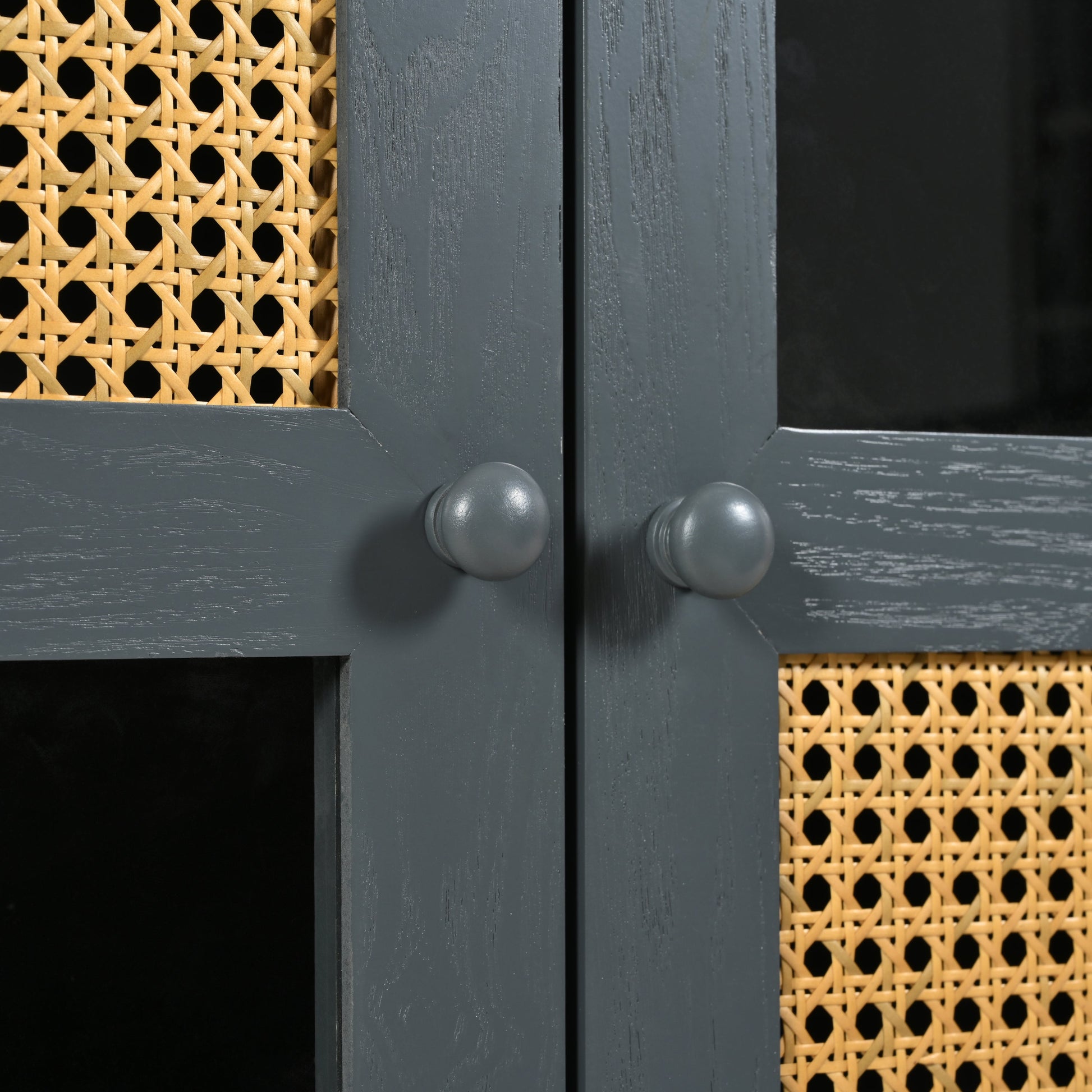 - Design detail: Four doors with wood handles and a dark frame contrasting original wood-colored rattan and glass