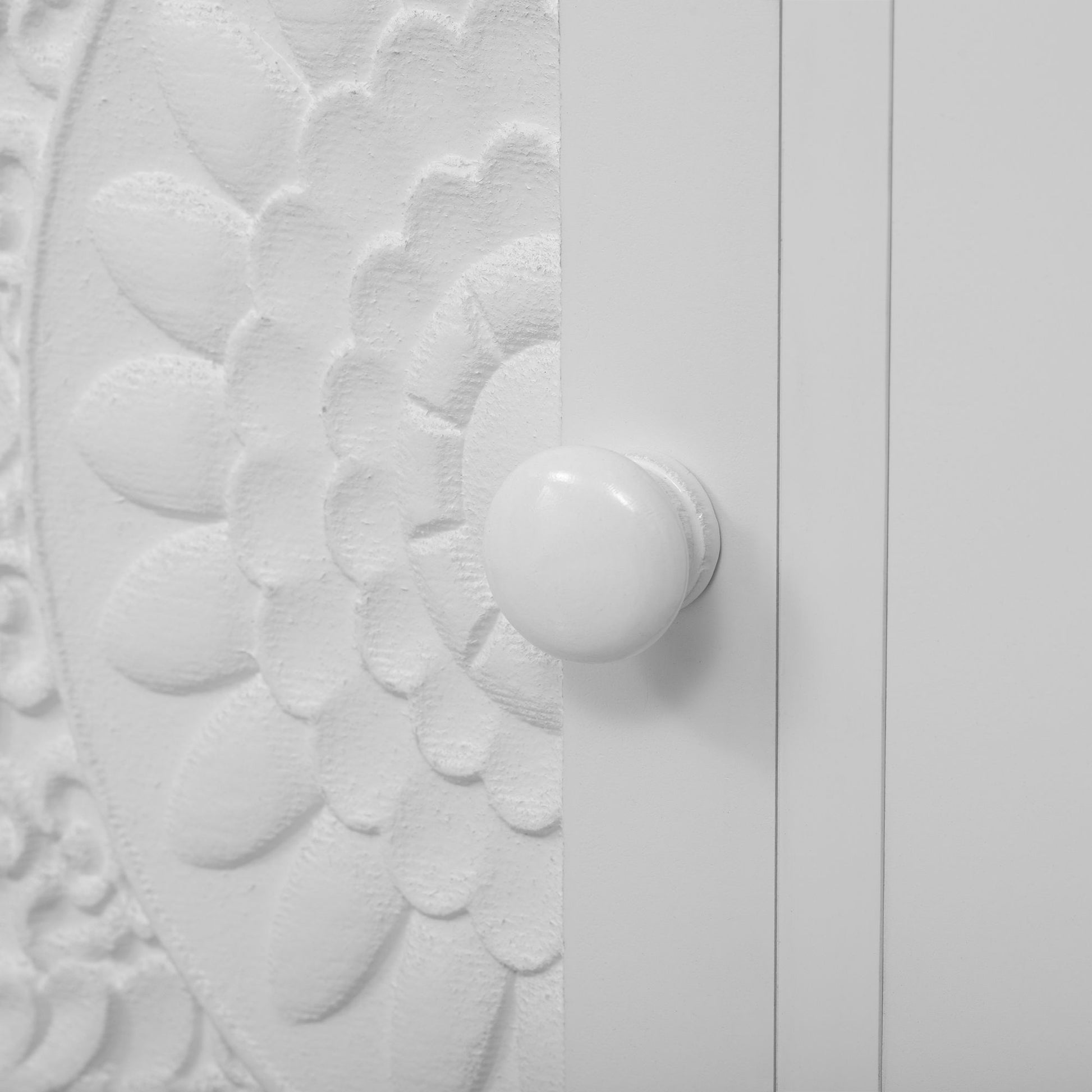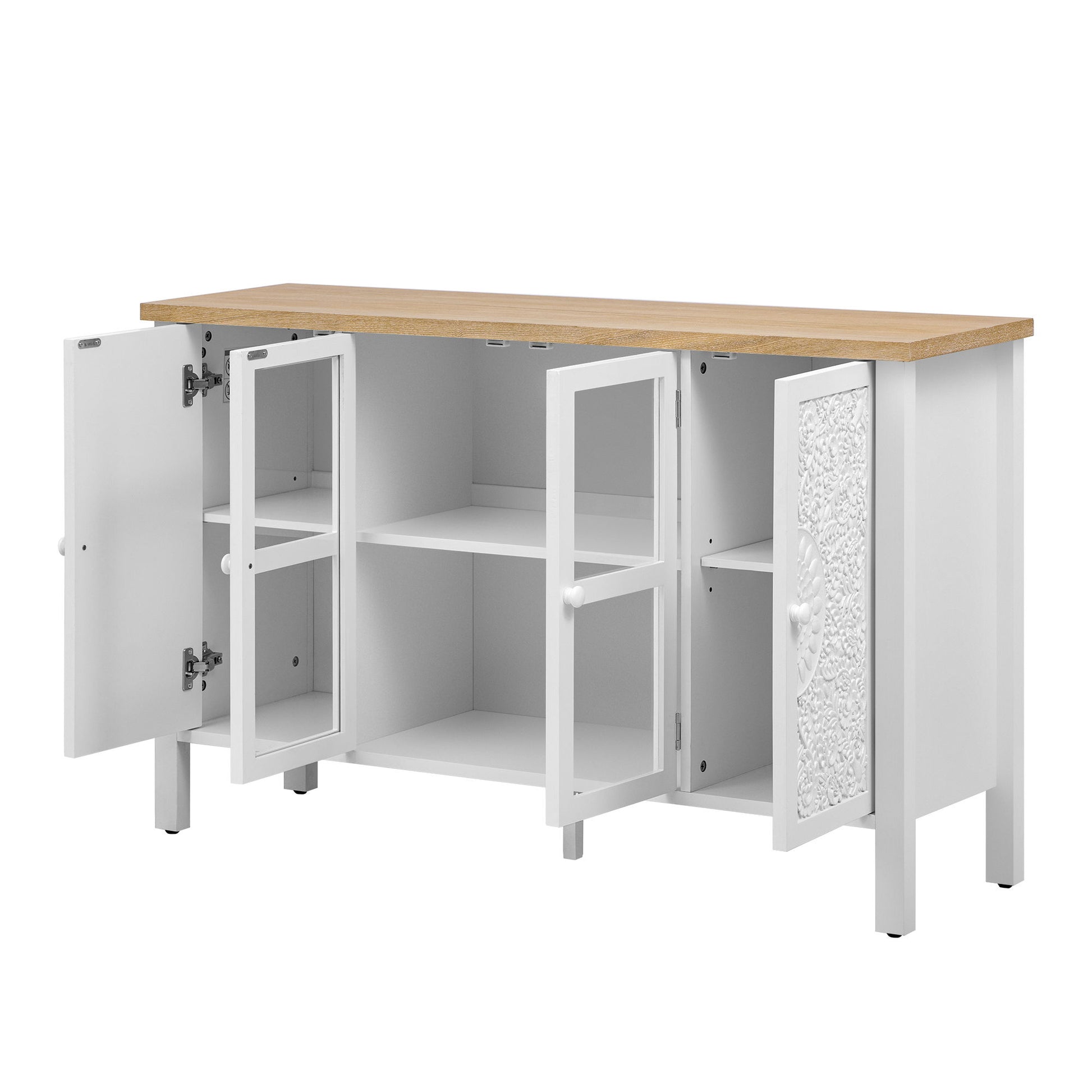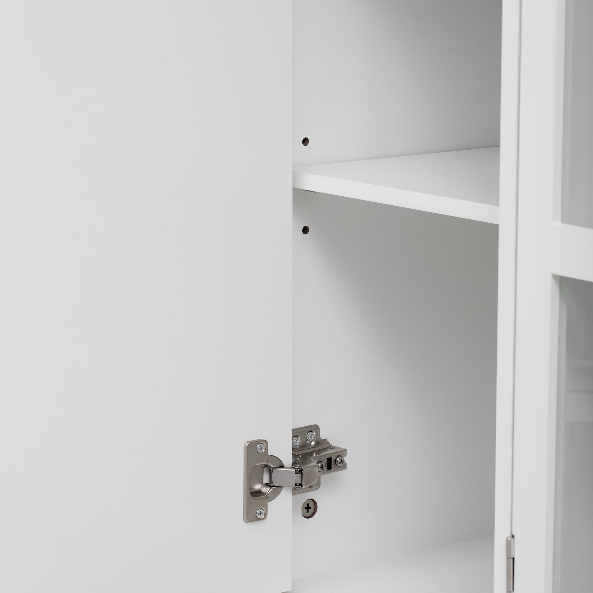 - Ample Storage Space: Including three spacious cabinets, the middle cabinet features a glass door that clearly displays the items inside. The cabinet doors on both sides are symmetrically carved with patterns, and each cabinet contains an adjustable shelf.