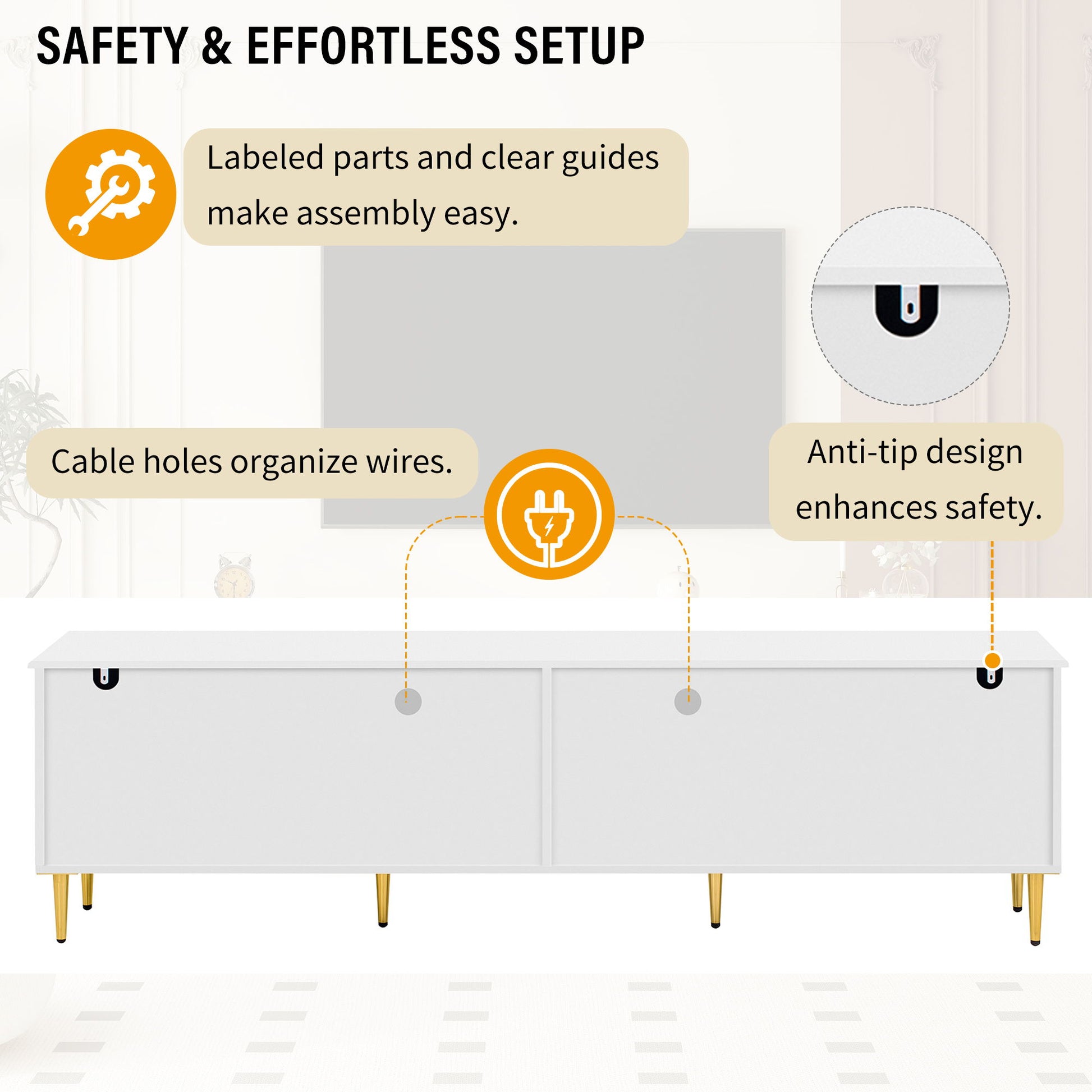 - Practical Features: Includes cable management holes for organized wiring and six sturdy metal legs for stability. An anti-tipping device ensures enhanced safety.