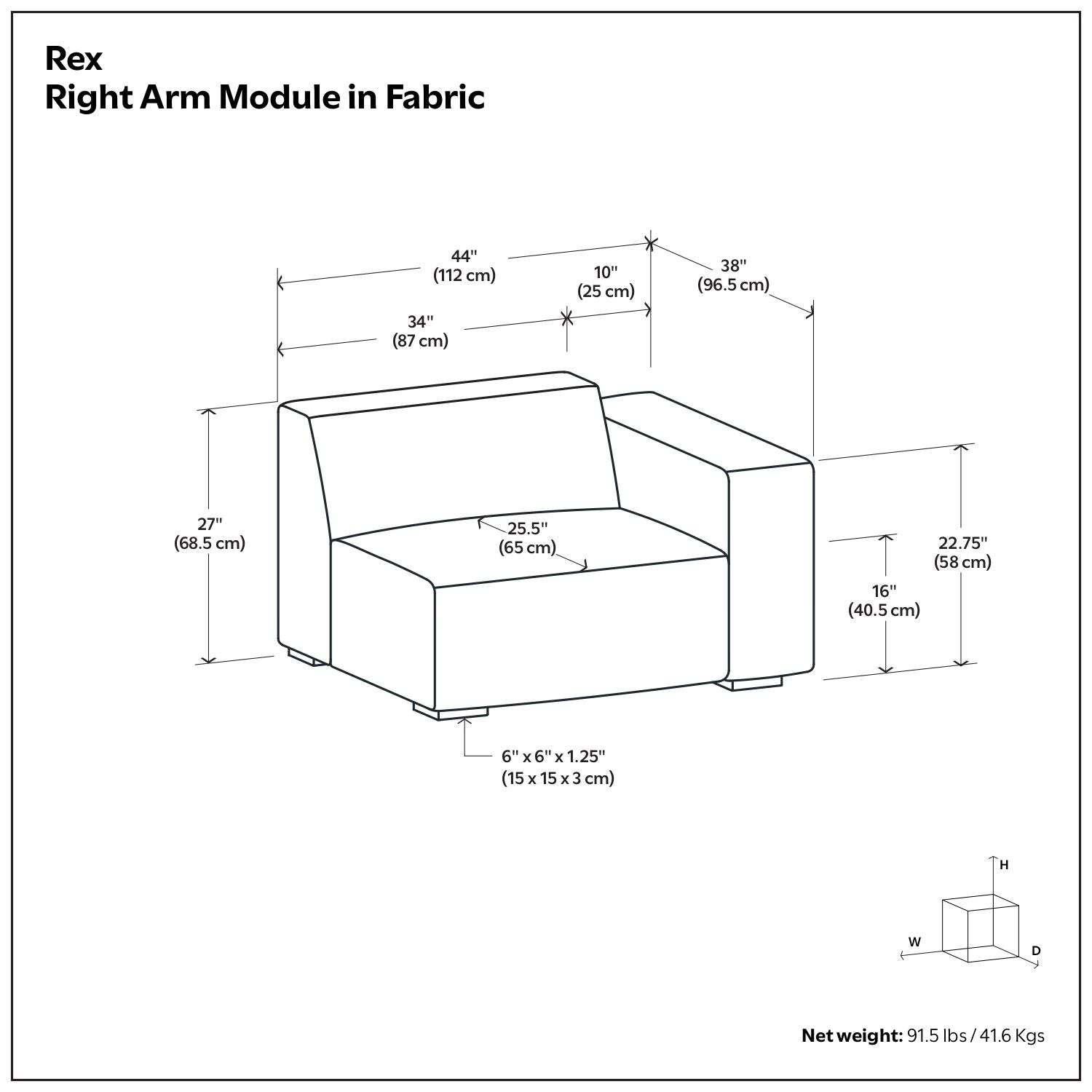 - This modern-style arm sofa module with a clean, boxy silhouette and a gently sloping back can be used on its own as an asymmetrical accent chair or combined with other pieces in our handcrafted Rex Modular Sofa Collection; this module accommodates up to 300 lbs.