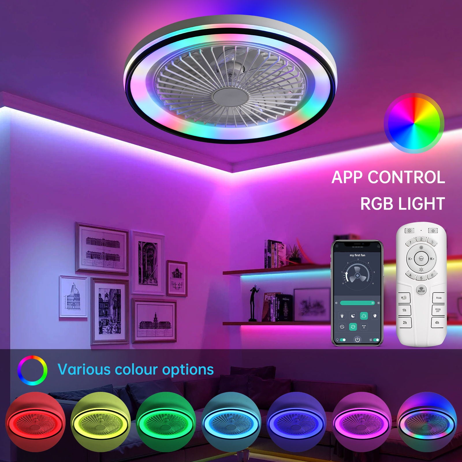 RGB Dimmable LED Enclosed Ceiling Fan With Light Flush Mount Bladeless, 6 Speed, Remote Control - White