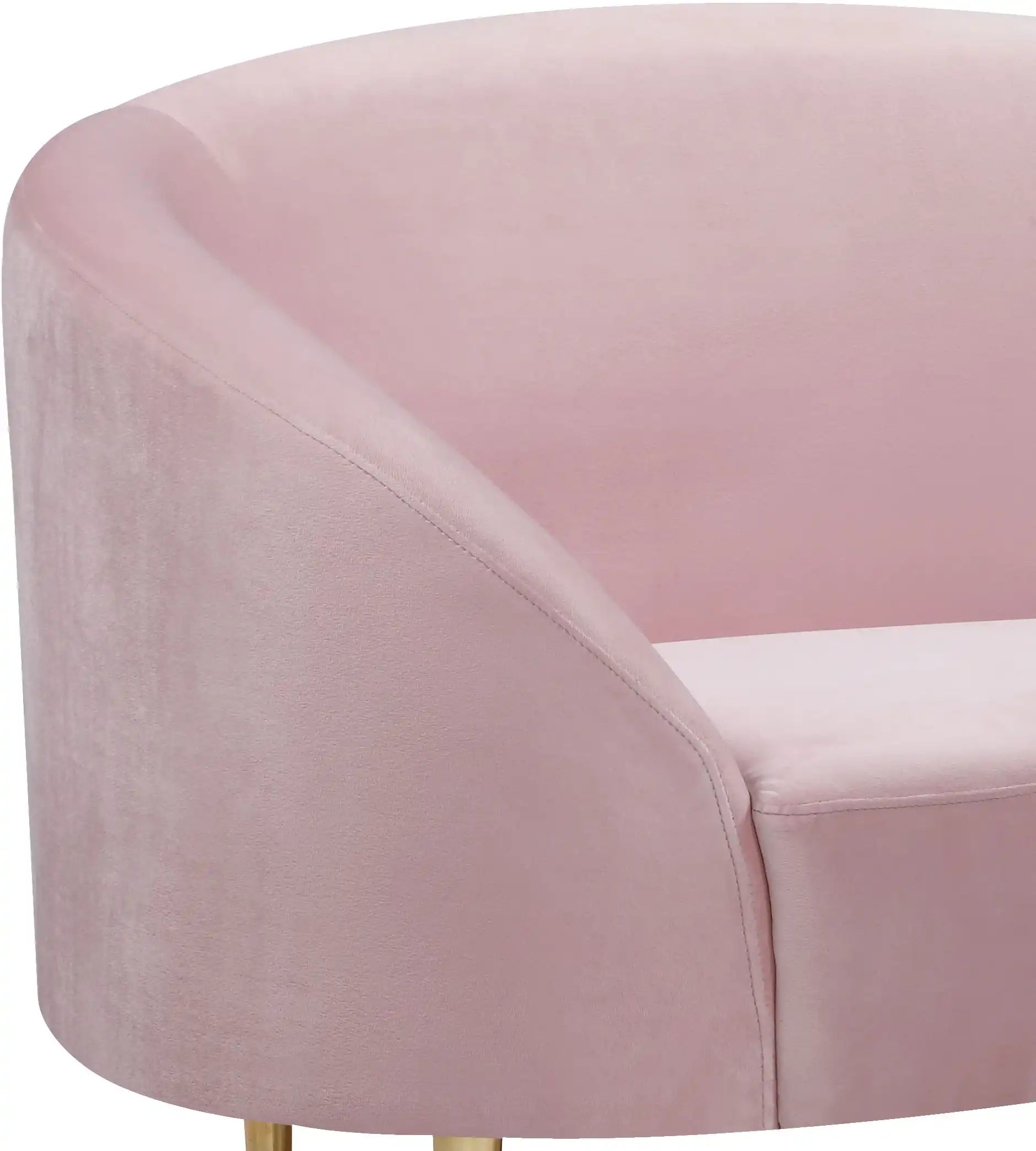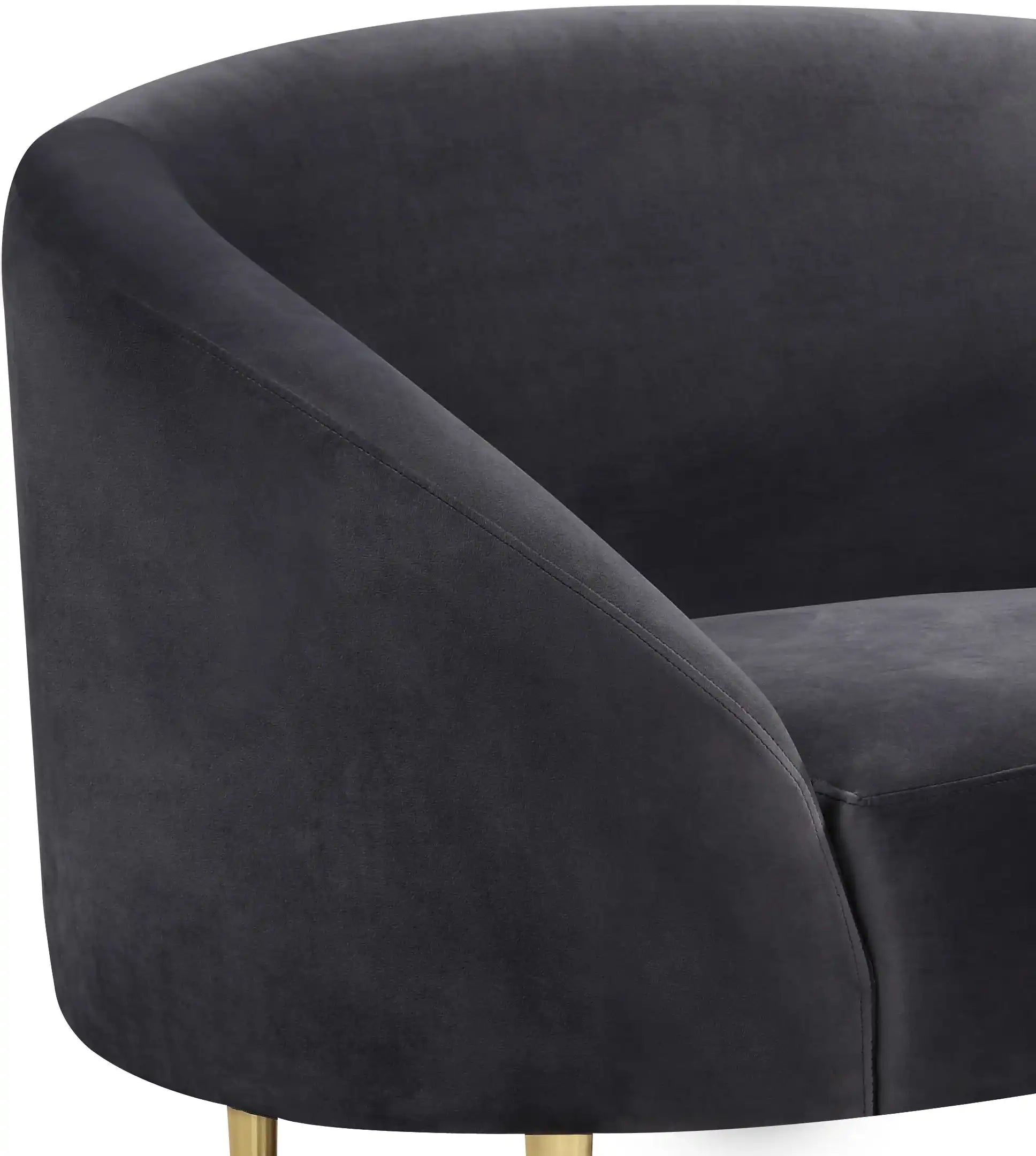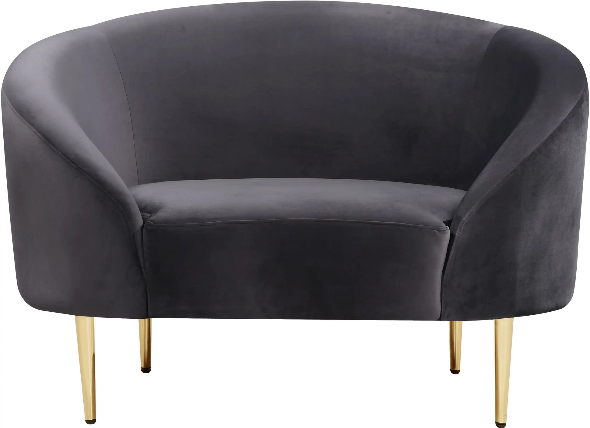 Get comfy while remaining chic in this elegant Ritz velvet chair. Plush-colored upholstery provides a soft texture that is pleasing to the senses, while its curved design offers a contemporary touch to your home furnishing. metal legs complement the chair's sophisticated color, creating a gallant piece anyone would be proud to display in their home.