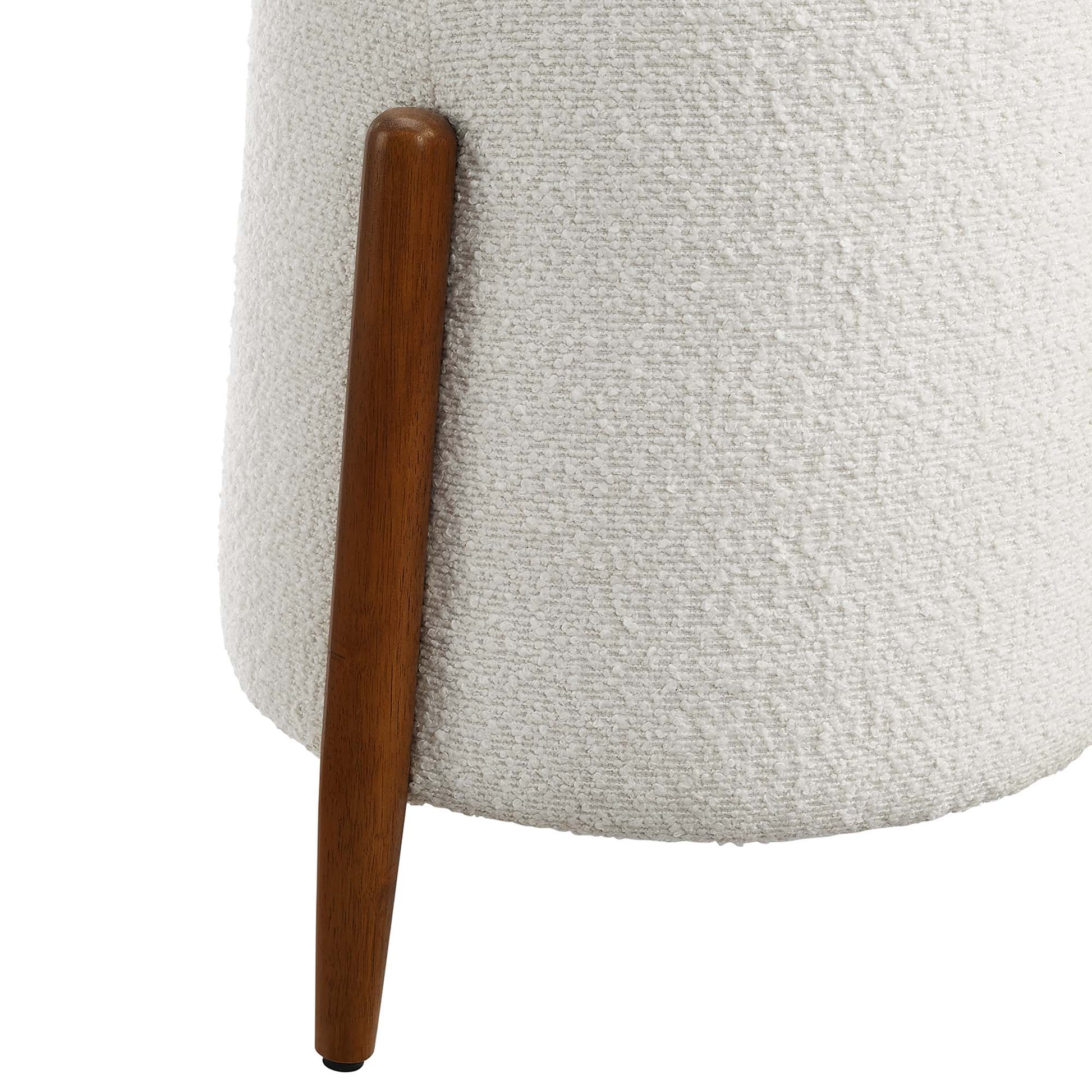 Immerse your living space in the sophisticated comfort of the Riven Ottoman. Upholstered in textured boucle fabric, this foam-padded, round ottoman stool radiates an air of elegance with a hint of modern panache. With its gentle curves and soft silhouette, this foot pouf ottoman stands on three tapered wood legs, elegantly affixed to the exterior of the footrest, providing a stable foundation while enhancing the piece�s overall shape with their sleek, splayed design. Whether it's accompanying your favorite armchair as a charming ottoman side table, used as an elegant vanity stool, or acting as a decorative ottoman in your living room, Riven's petite stature is designed to fit into any decor, offering a multifunctional ottoman for everyday needs. Celebrate the seamless blend of texture and form with this exquisite boucle ottoman, bound to become a cherished addition to your home furniture collection. Assembly Required. Weight Capacity: 264 lbs.