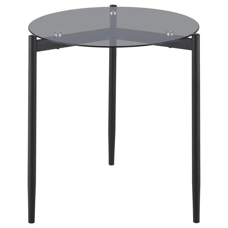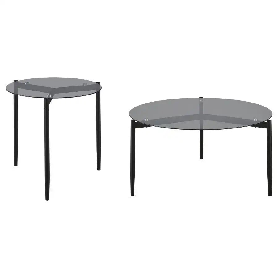 This modern coffee table set includes a sleek coffee table and matching side table, both featuring tempered smoked glass tops for lasting durability and style. Supported by sturdy black powder-coated metal bases with a sandy texture, the set exudes contemporary elegance. The minimalist round designs ensure versatile functionality and seamless integration into any living space. Perfect for creating a cohesive and modern focal point.