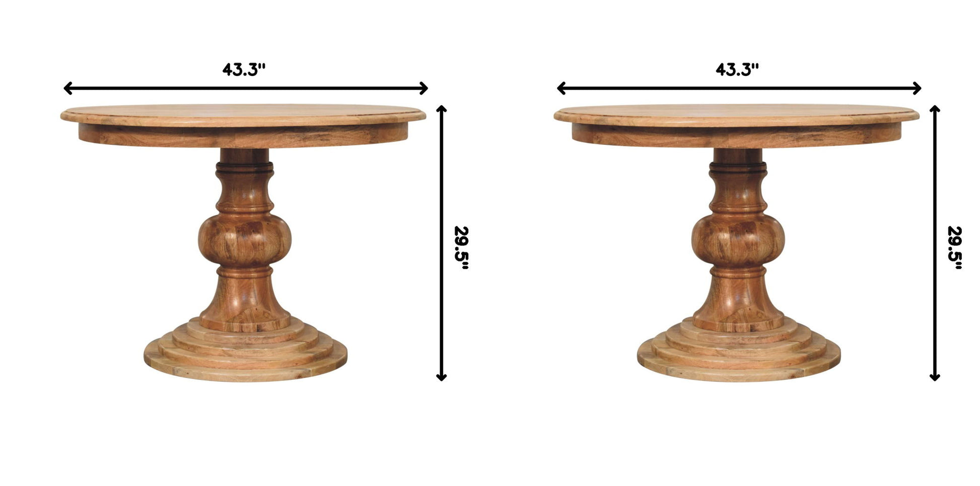 - Round Turned Dining Table - Create an elegant dining experience with this Round Turned Dining Table. Drawing inspiration from a classic French design it combines graceful curves with warm wood tones. Crafted from solid mango wood with an oak-ish finish this round table is the perfect piece for any dining room or kitchen. Every piece of furniture is individually handcrafted and includes swing care tickets explaining the cautions and aftercare instructions.