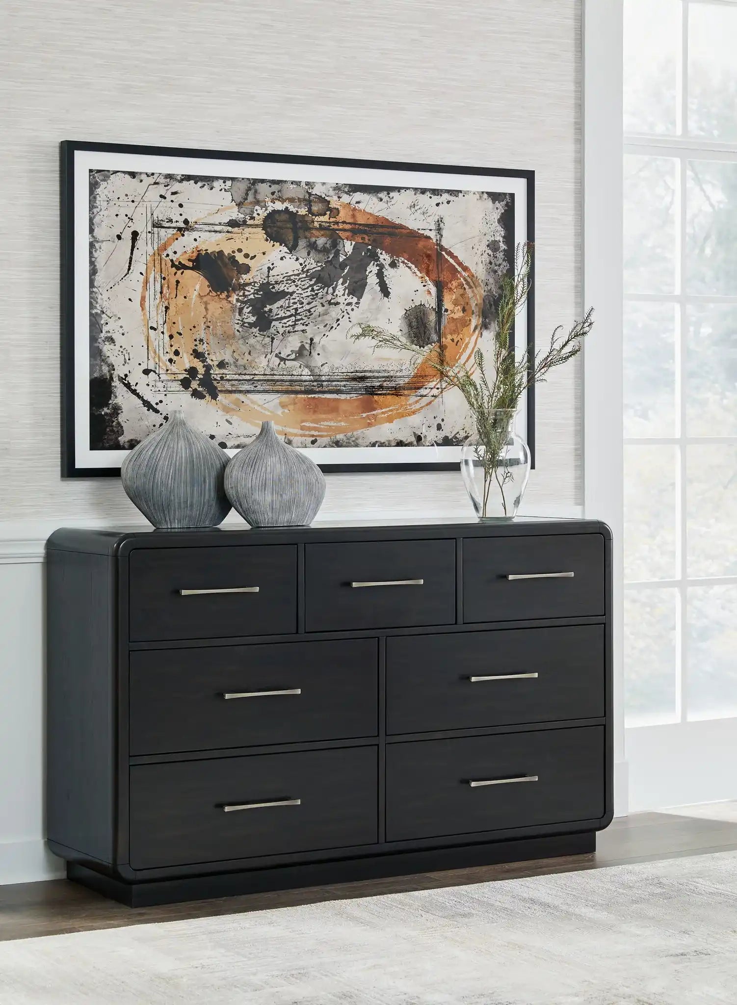 Rowanbeck - 7 Pc. - Dresser, Mirror, Chest, California King Upholstered Panel Bed, 2 Nightstands - Gray / Black