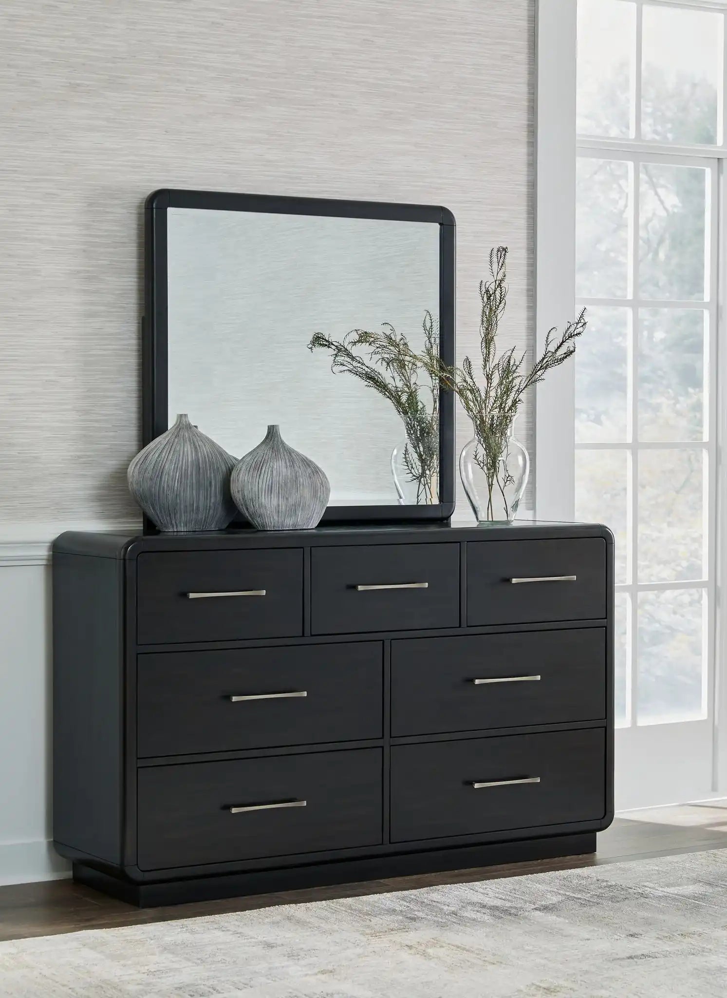 Rowanbeck - 4 Pc. - Dresser, Mirror, California King Upholstered Panel Bed - Gray / Black