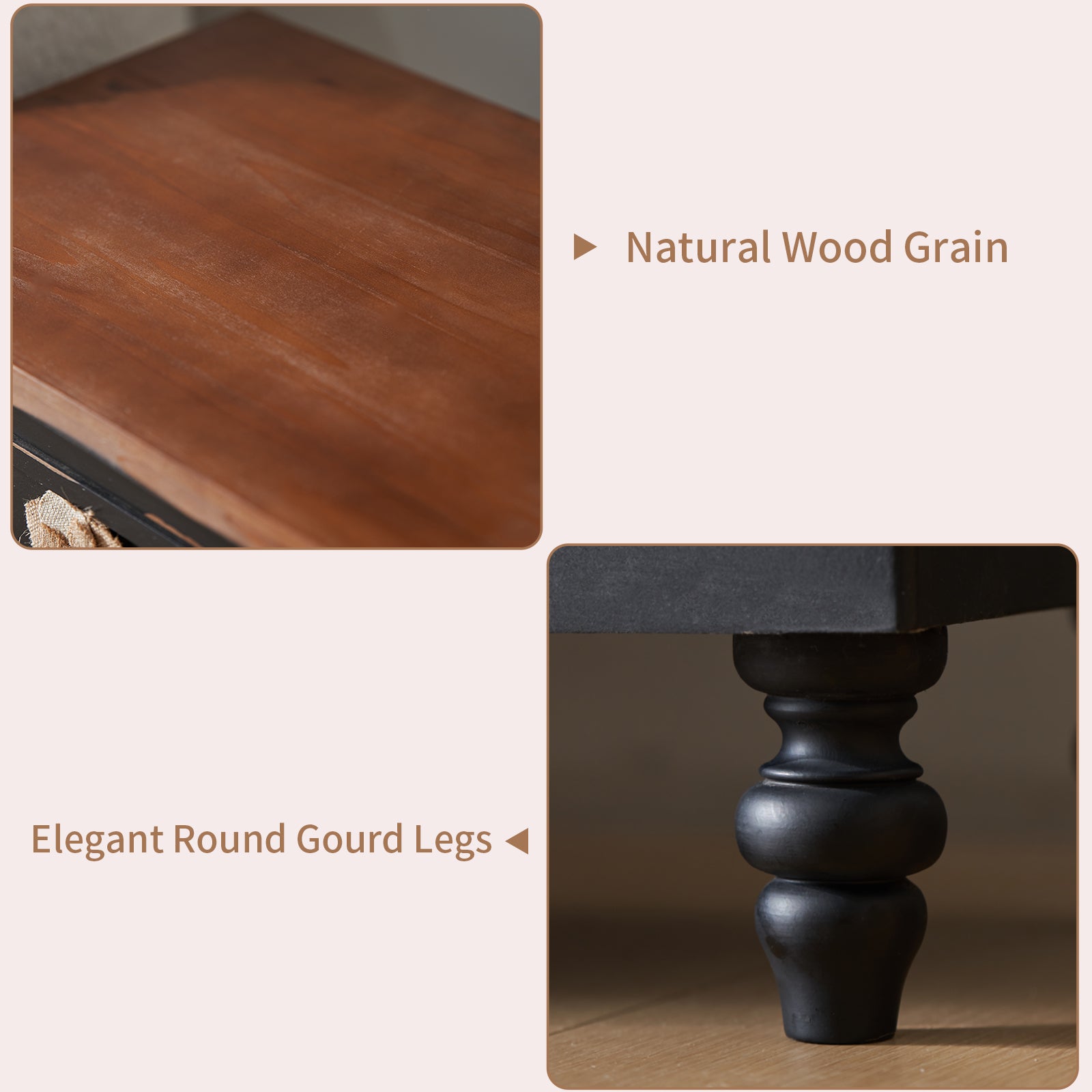 - Distressed antique black body with a natural walnut wood top and drawer interiors