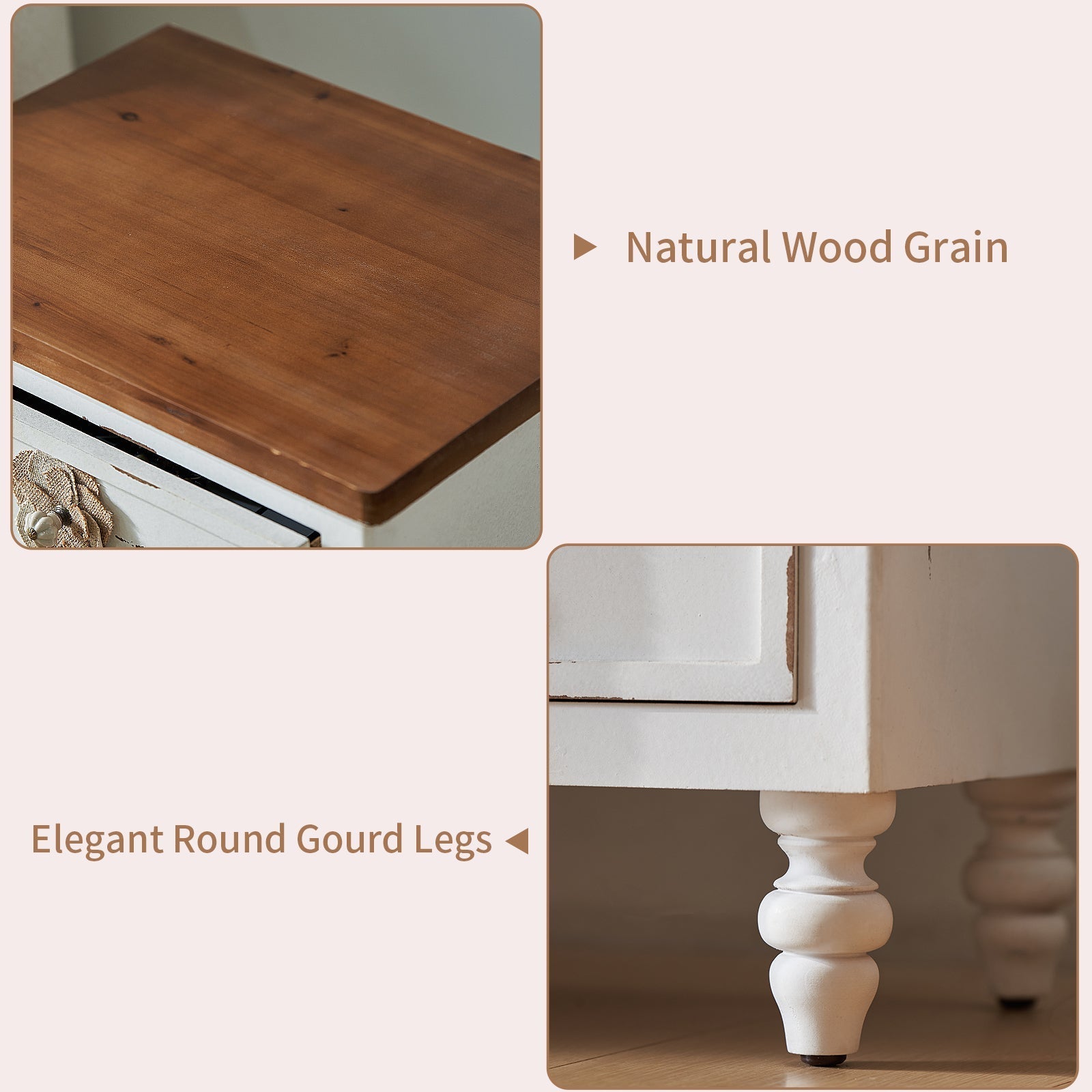 - Antique white painted cabinet body complemented by a walnut-toned natural wood top and drawer interiors.