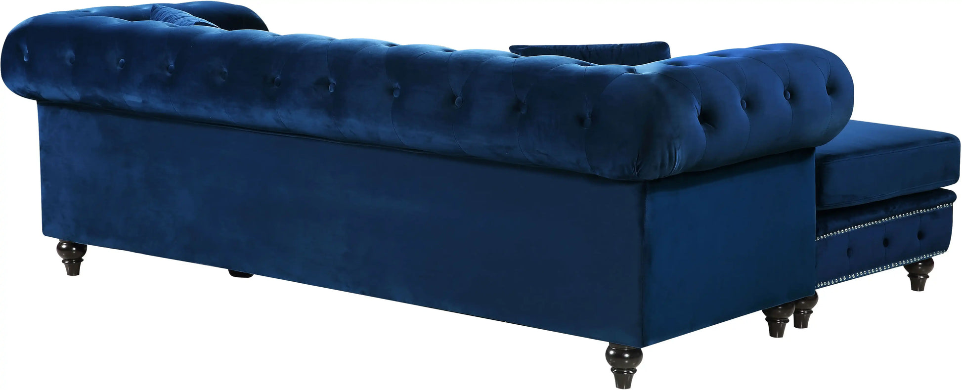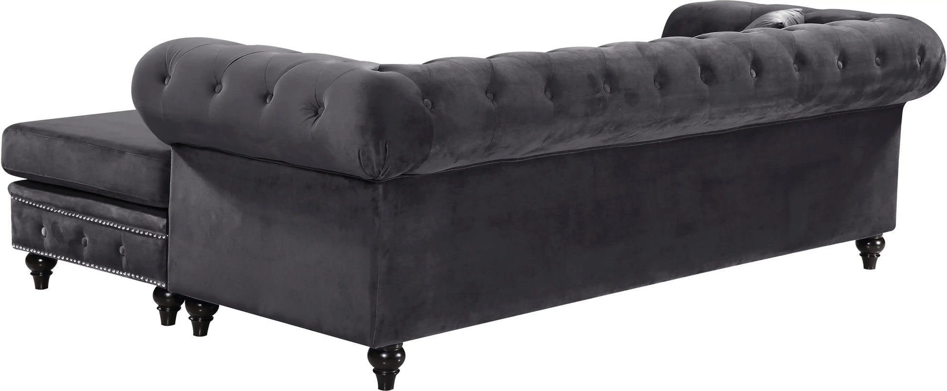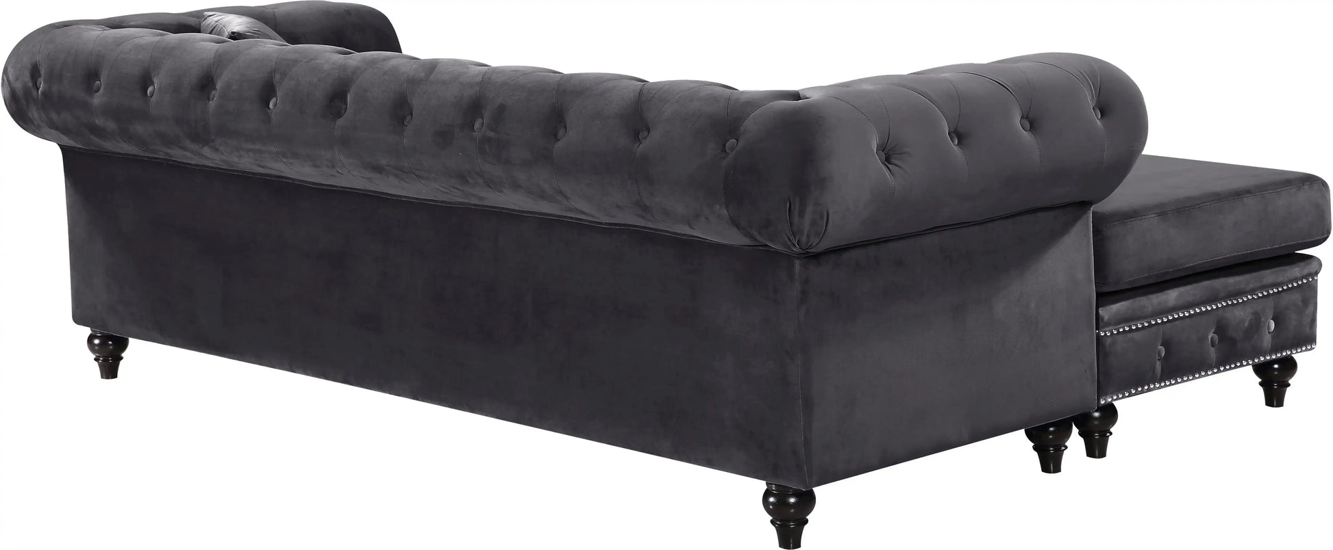 Lounge in luxurious style and comfort with this sleek Sabrina velvet reversible sectional. Featuring elegant, plush velvet upholstery and a deep tufted back, this sectional is a little piece of heaven for you to kick back and relax on. Double row nailheads give the sectional a contemporary element, and a reversible chaise offers a comfortable place to kick up your feet after a long day. Pillows are included as well to add to your comfort.