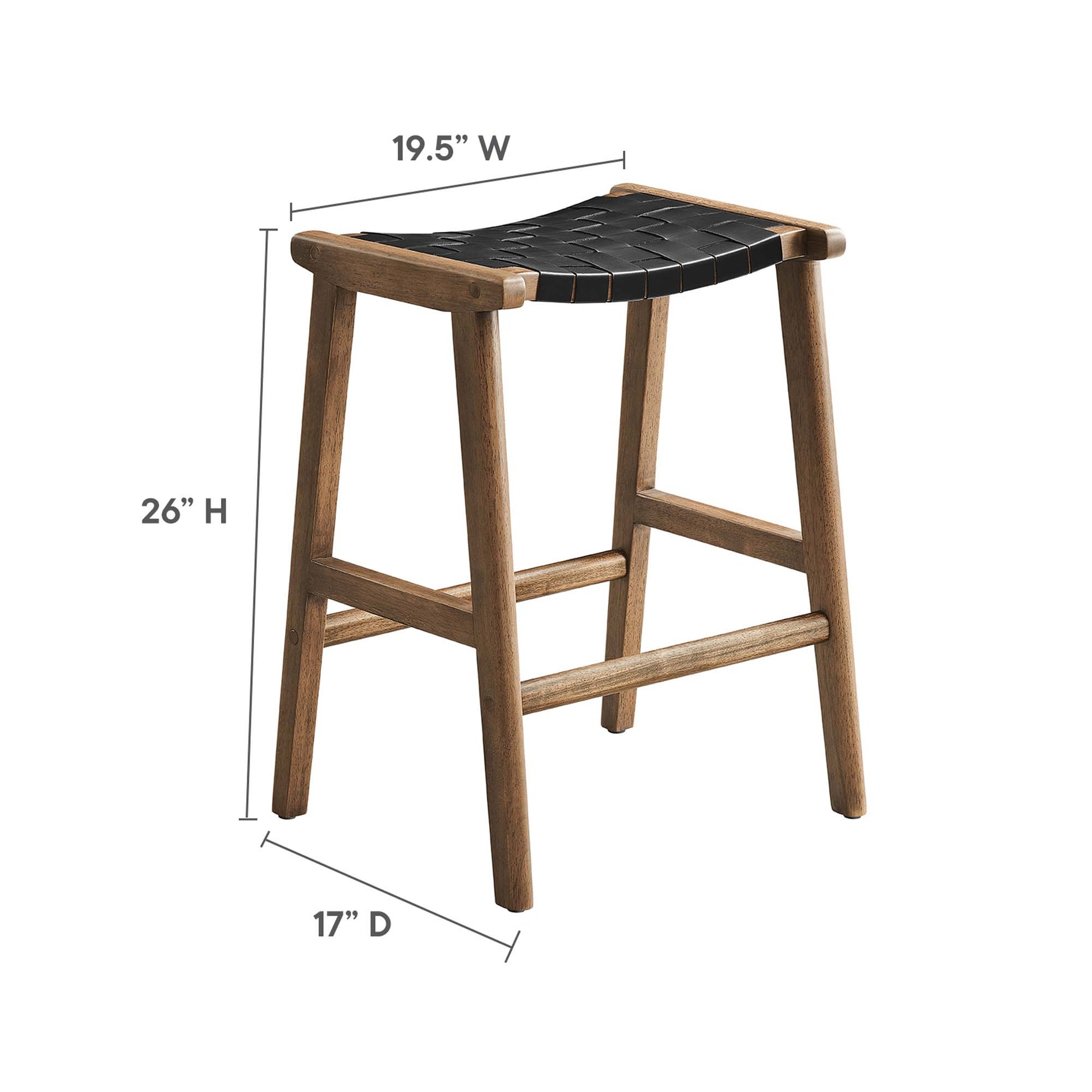 Spark engaging conversations with the Saoirse Counter Stool Set of Two. Artfully crafted with woven leather over a sturdy rubberwood frame, this set of two counter stools blends contemporary design with tactile elegance. Non-marking foot pads ensure both stability and floor protection, while the basket weave design, footrests, and side supports make for a personalized seating experience. These counter stools are perfect for the kitchen, breakfast nook, bar area, dining counter, or entertainment room. Assembly required. Weight Capacity: 331 lbs.