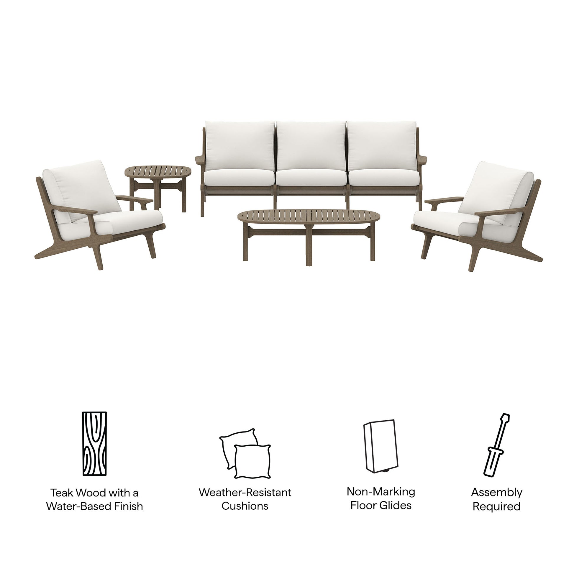 Refresh your outdoor space with the Saratoga 4-Piece Patio Furniture Set. Expertly crafted from durable teak wood with a water-based finish that highlights its natural grain, this backyard furniture set includes a sofa, two lounge chairs, and a coffee table. The sofa and lounge chairs feature an angular frame with sculpted armrests, slatted seat foundations, and plush seat and back cushions covered in weather-resistant, water-resistant, and stain-resistant fabric for easy maintenance and year-round relaxation. The coffee table boasts a beautifully slatted top with an intersecting stretcher base, offering both durability and a refined silhouette. Perfect for patios, porches, and outdoor lounge areas, the Saratoga 4 Piece Patio Set blends modern design with timeless craftsmanship. Assembly required.