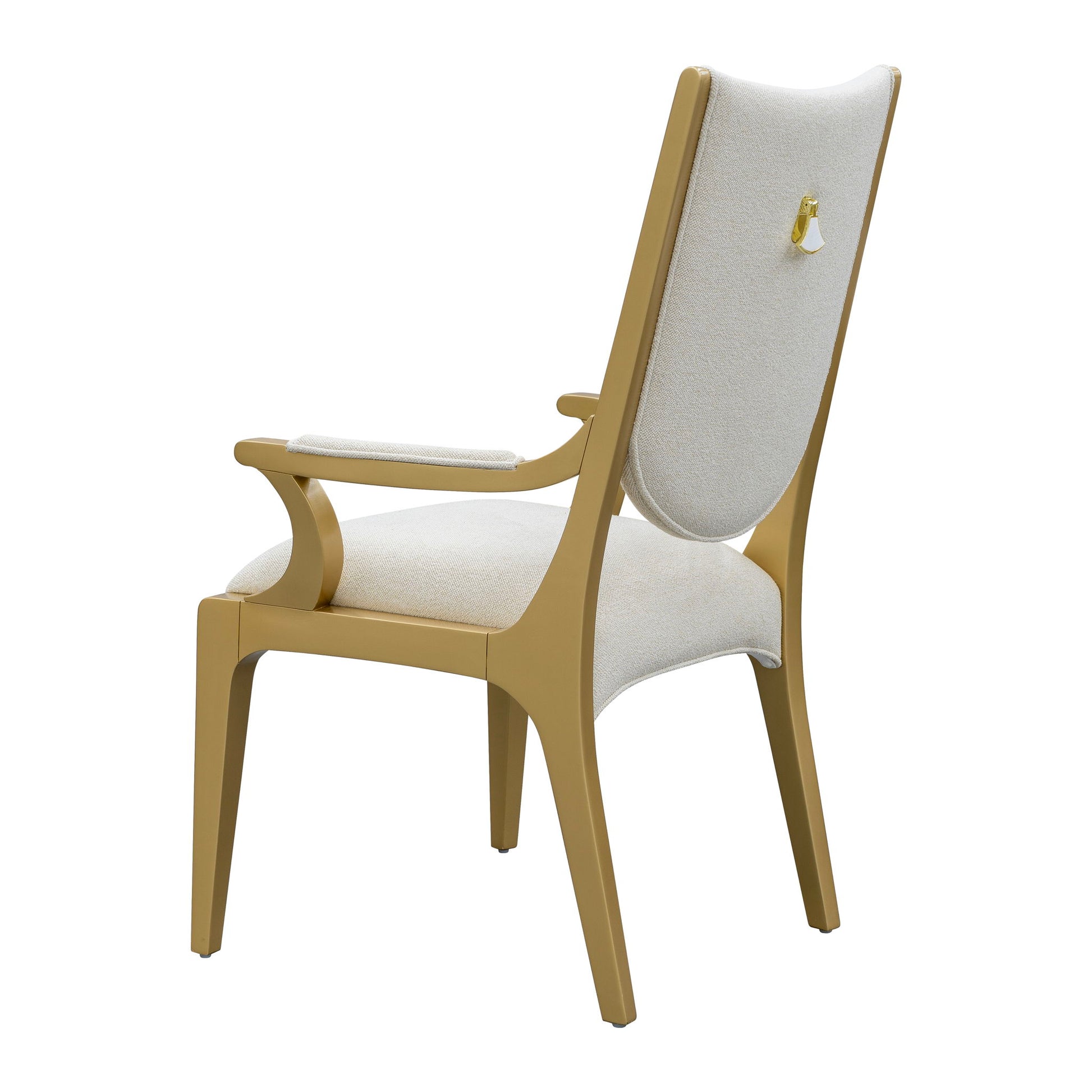 Refined and sculptural, the dining arm chair captures modern glamour with an effortless touch. The frame is finished in a radiant gold, elegantly offset by plush chenille upholstery in a soft, understated cornsilk hue. Gently curved arms with upholstered rests offer both comfort and refinement, while tapered solid rubberwood legs ensure lasting support. A gold metal and mother of pearl accent graces the back, adding a luminous finishing detail that elevates any dining setting.