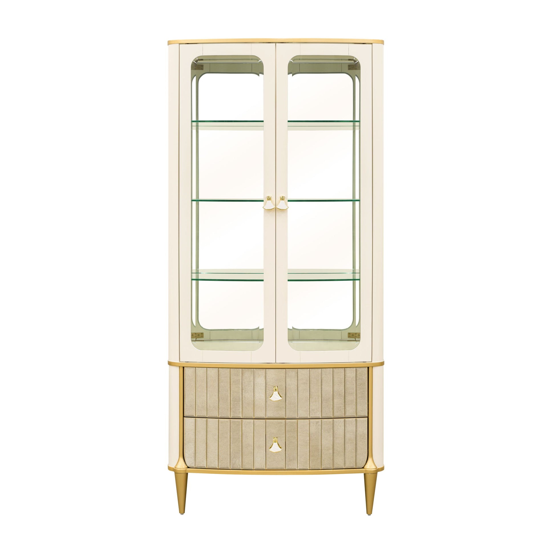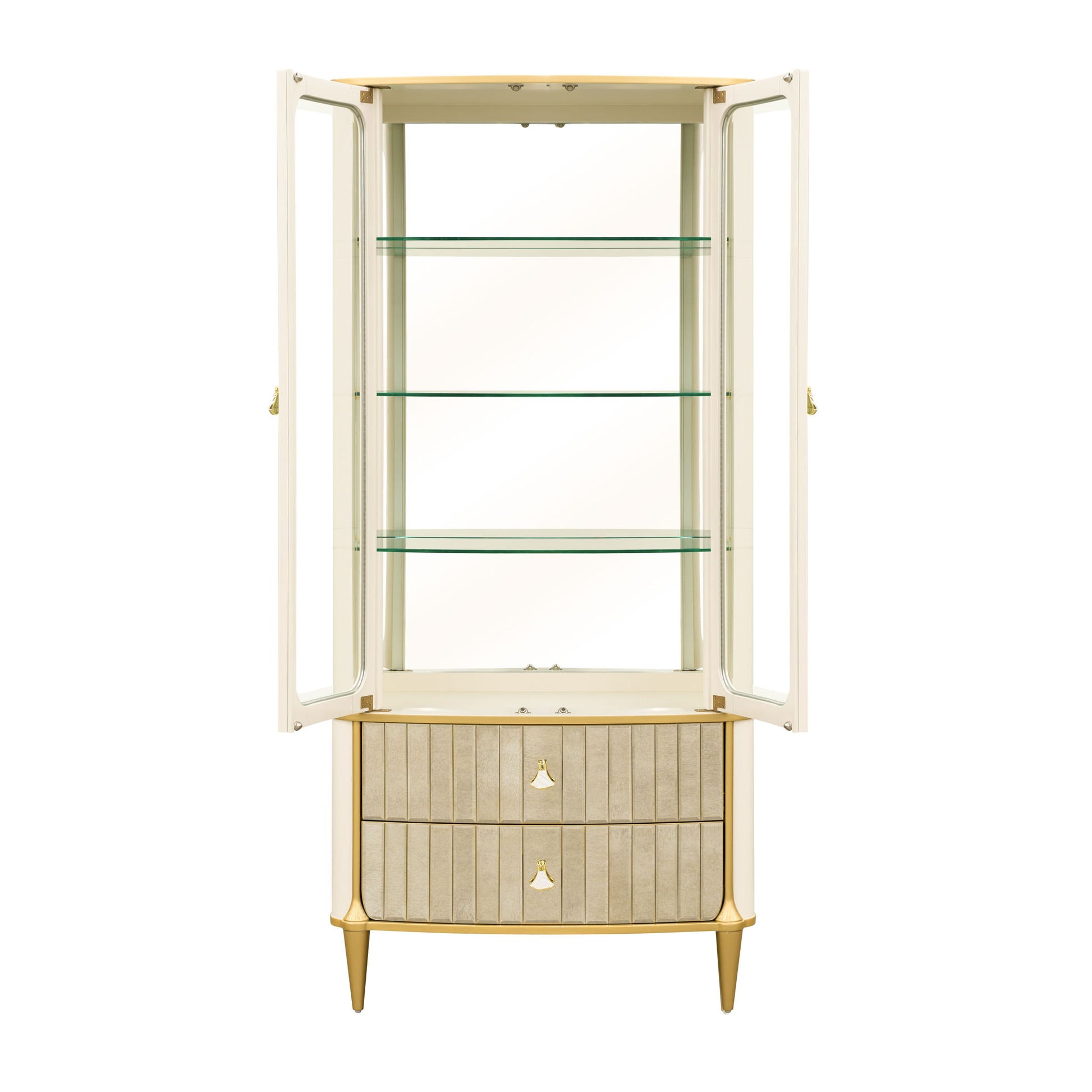 Elevate your living space with the luminous sophistication of the Scotts Square Display Cabinet. Cloaked in a soft champagne finish and framed in radiant gold trim, its tall, stately silhouette commands attention with effortless grace. Beveled glass doors reveal three adjustable glass shelves, illuminated by motion-activated LED lighting that bathes your curated treasures in a warm, inviting glow. Below, antique mirrored drawer fronts add a glamorous reflection of style, while drawers lined in rich red velvet offer discreet, sumptuous storage. Sculptural gold and mother of pearl hardware completes the design, infusing every detail with opulent refinement.