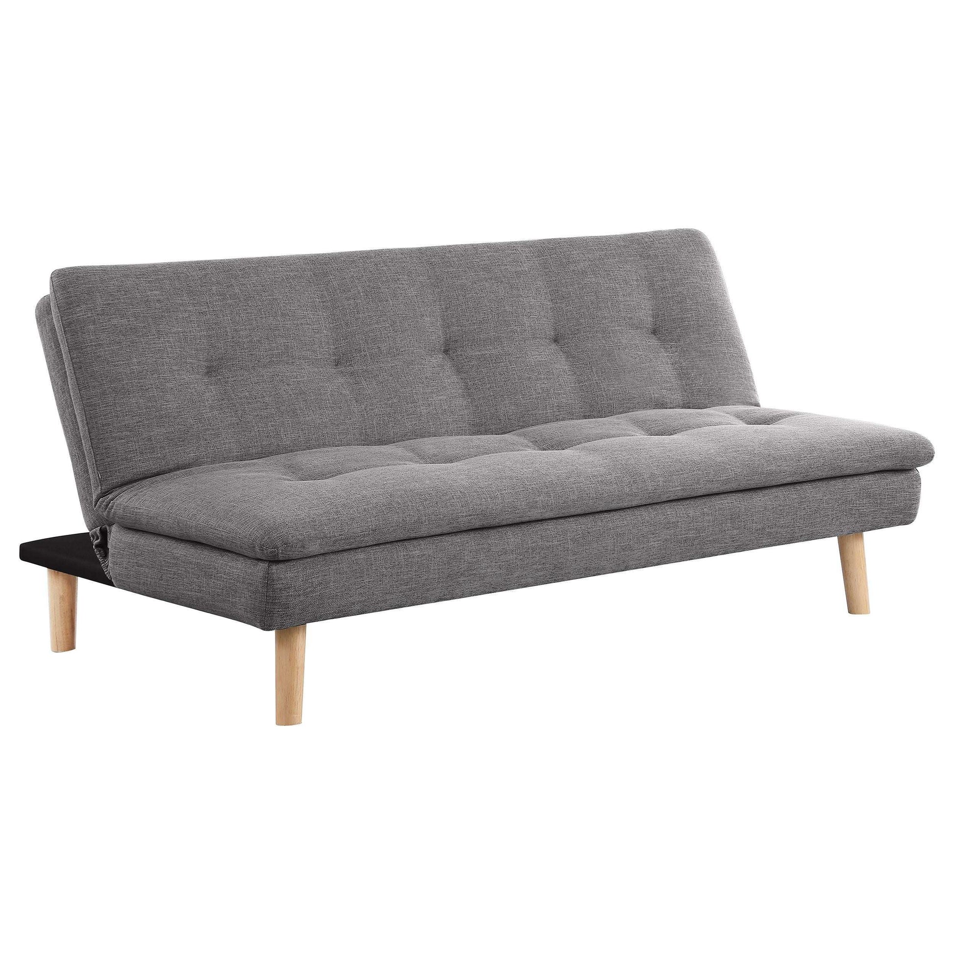 Create maximum flexibility in your space with a modern sofa that folds flat to create a bed when guests spend the night. The sofa is a minimalist design complete with an armless silhouette. It's upholstered in a medium gray, offering chic style in a den or home office. Its foam cushions is gently tufted to add depth and texture. The sofa rests on tapered, splayed legs with a natural wood finish, adding a light, airy final touch.