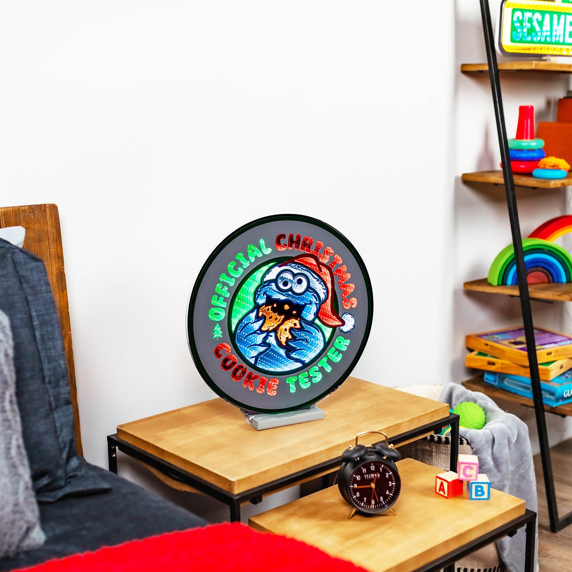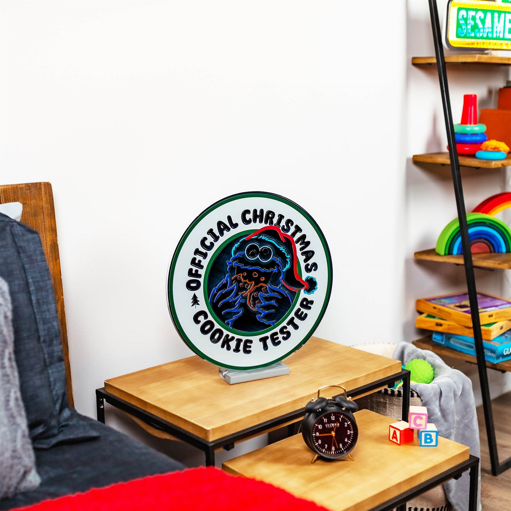 Get ready for a cookie-filled holiday with the Sesame Street Holiday Cookie Sign Ekkolight! Featuring Cookie Monster happily munching on his favorite treat, surrounded by the playful phrase "Official Christmas Cookie Tester", this LED light shines in festive red and green tones, bringing a fun, holiday spirit to your décor. Perfect for kids' rooms, play spaces, or kitchen holiday décor, this playful and heartwarming design is sure to brighten up your seasonal decor spaces. Created in colaboration with Sesame Street, let Cookie Monster brighten up your holidays with his big smile and boundless energy!