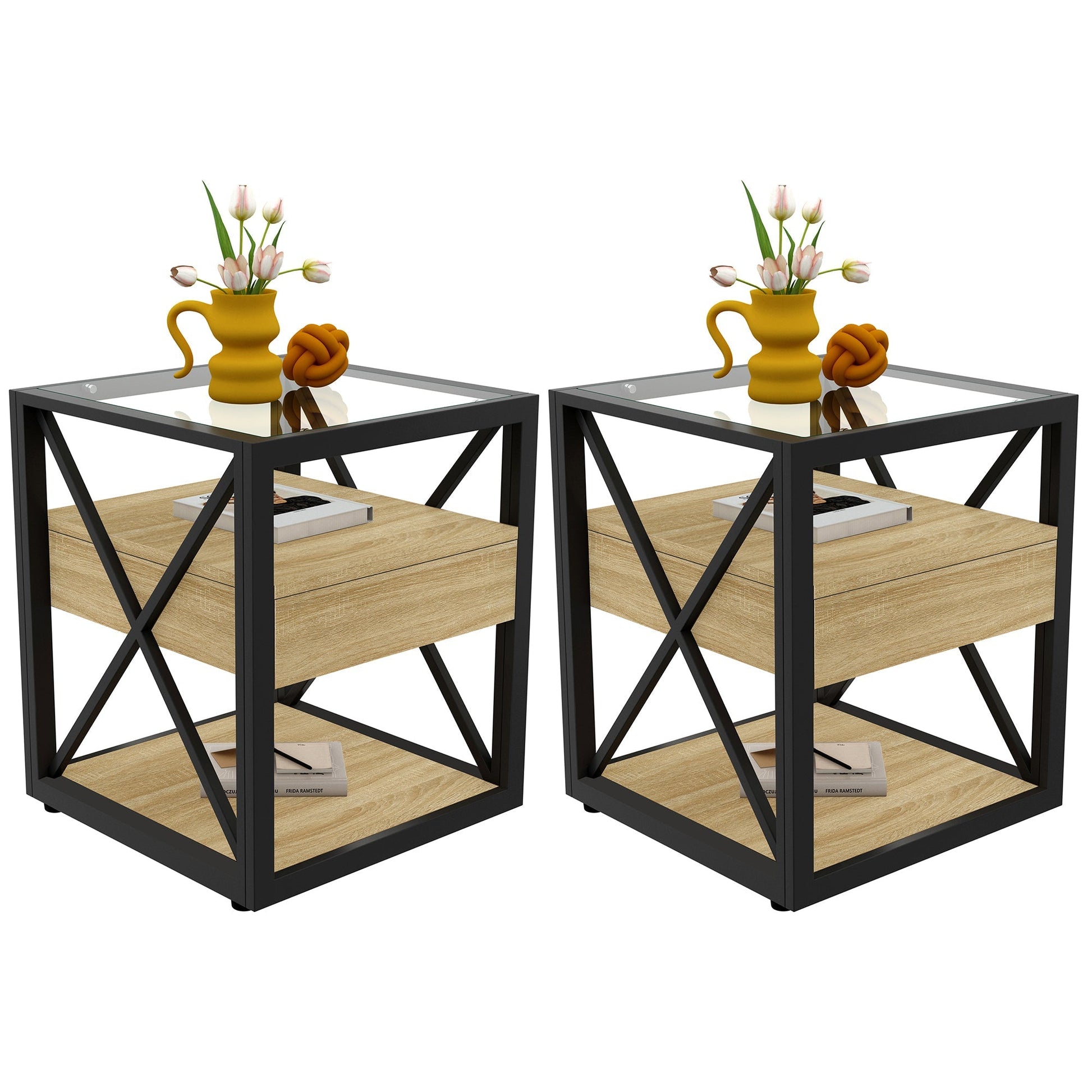 Set of 2 Modern End Tables with Drawer - Nightstands for Bedroom & Living Room