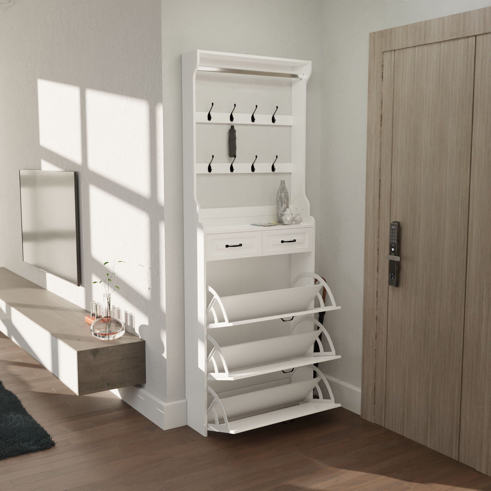 Shoe Cabinet With 3 Doors 2 Drawers With Hanger, Door With Shape, Large Space For Storage - White