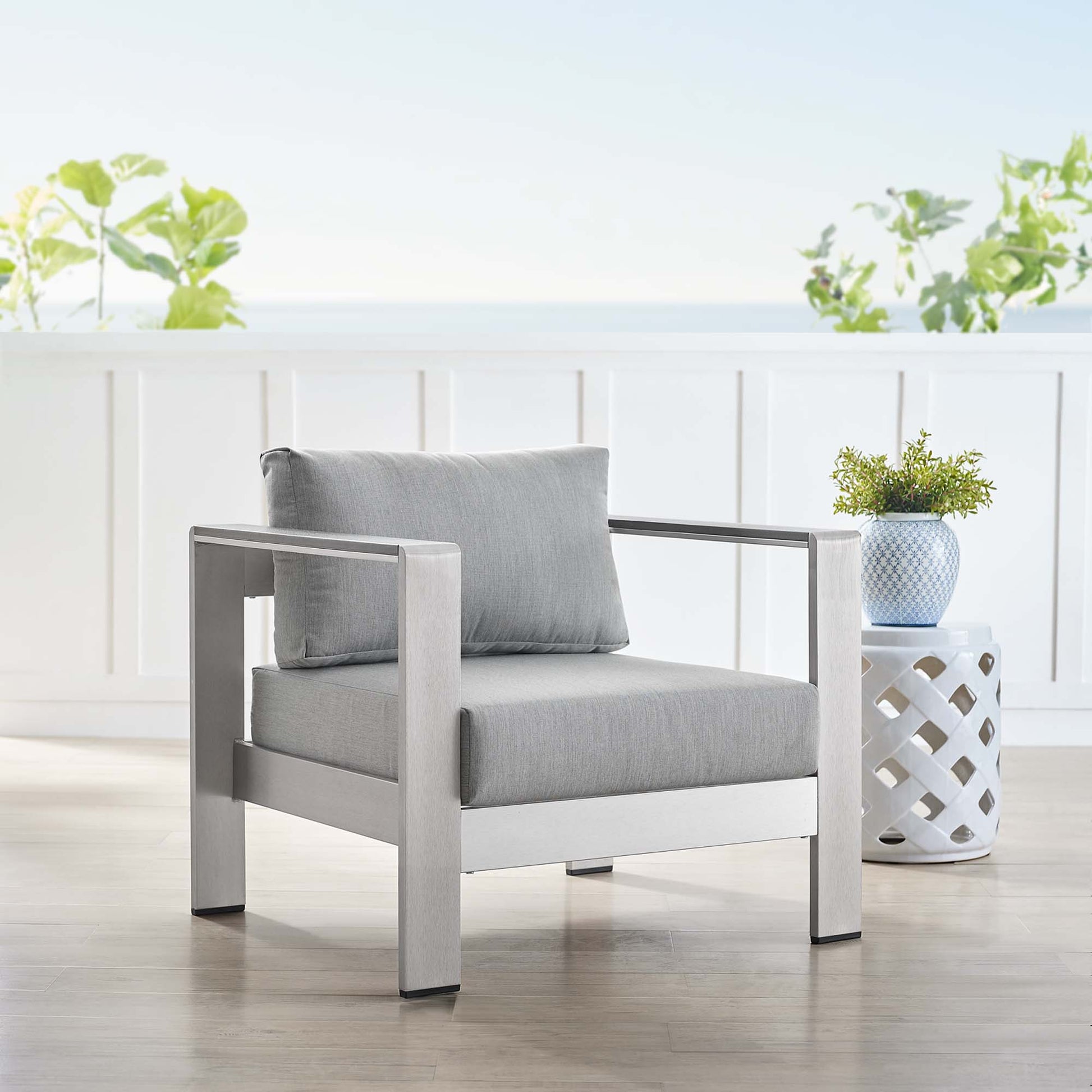 Enjoy your patio or backyard leisure time with the strong and durable Shore Outdoor Aluminum Armchair. Made with an anodized brushed aluminum frame and non-marking black plastic foot caps, Shore comes outfitted with resilient Sunbrella� fabric canvas cushions tested to last through all weather conditions. The Shore Outdoor Aluminum Armchair complements your casual gatherings with a look and functionality you can rely on.