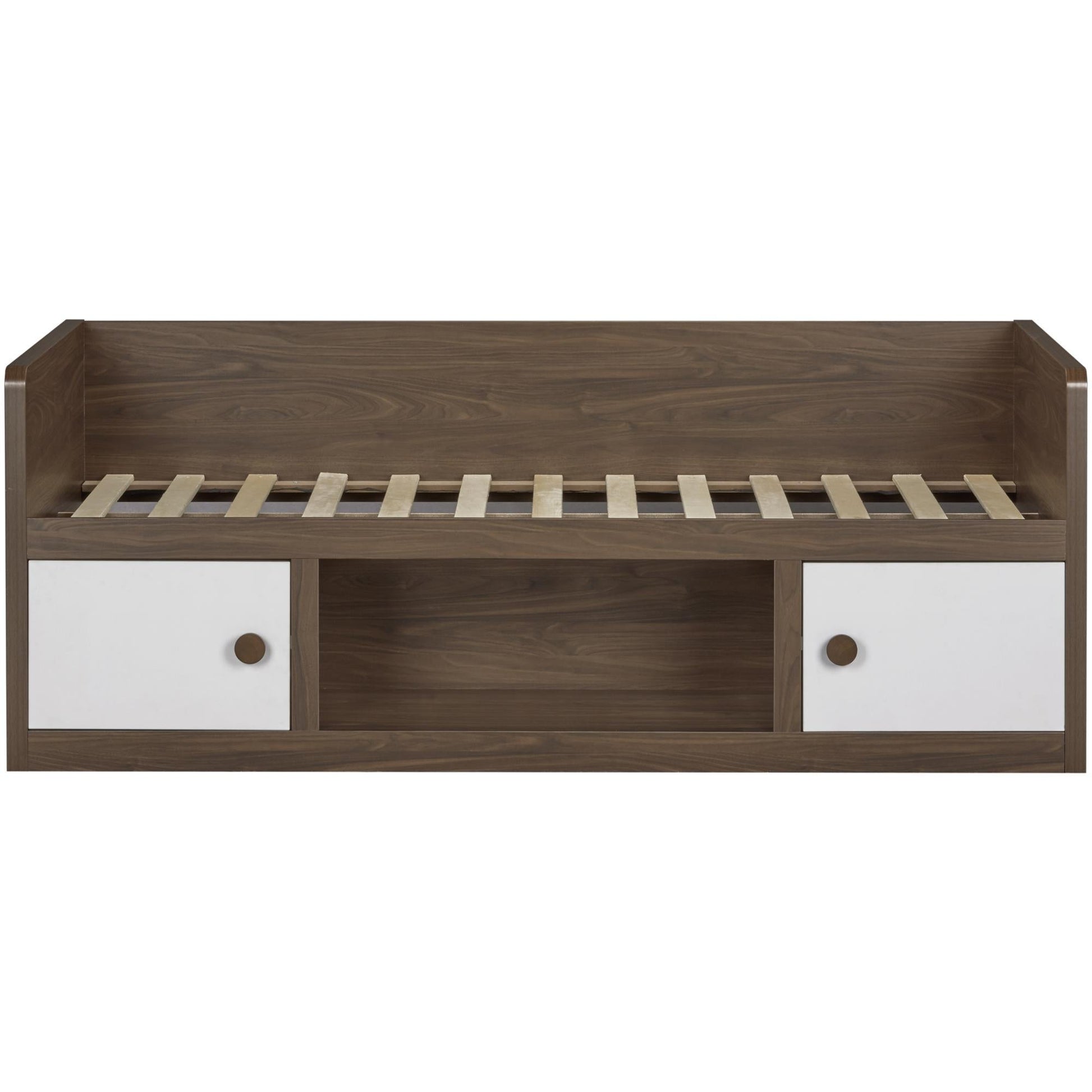 - Non-toxic walnut finish with contrasting white drawer fronts