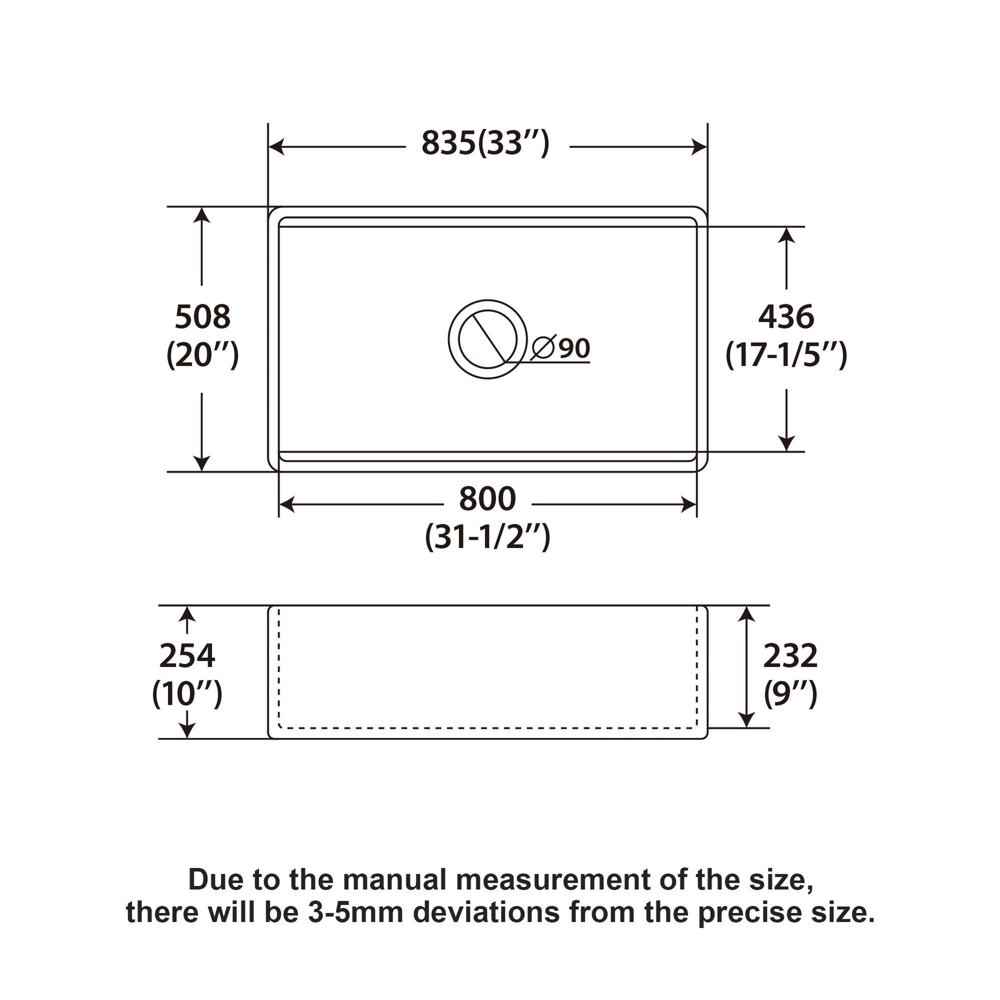- Stylish Deep White Kitchen Sink Size: Measures 33 x 20 x 10 inches with a standard 3-1/2-inch drain compatible with most garbage disposals.