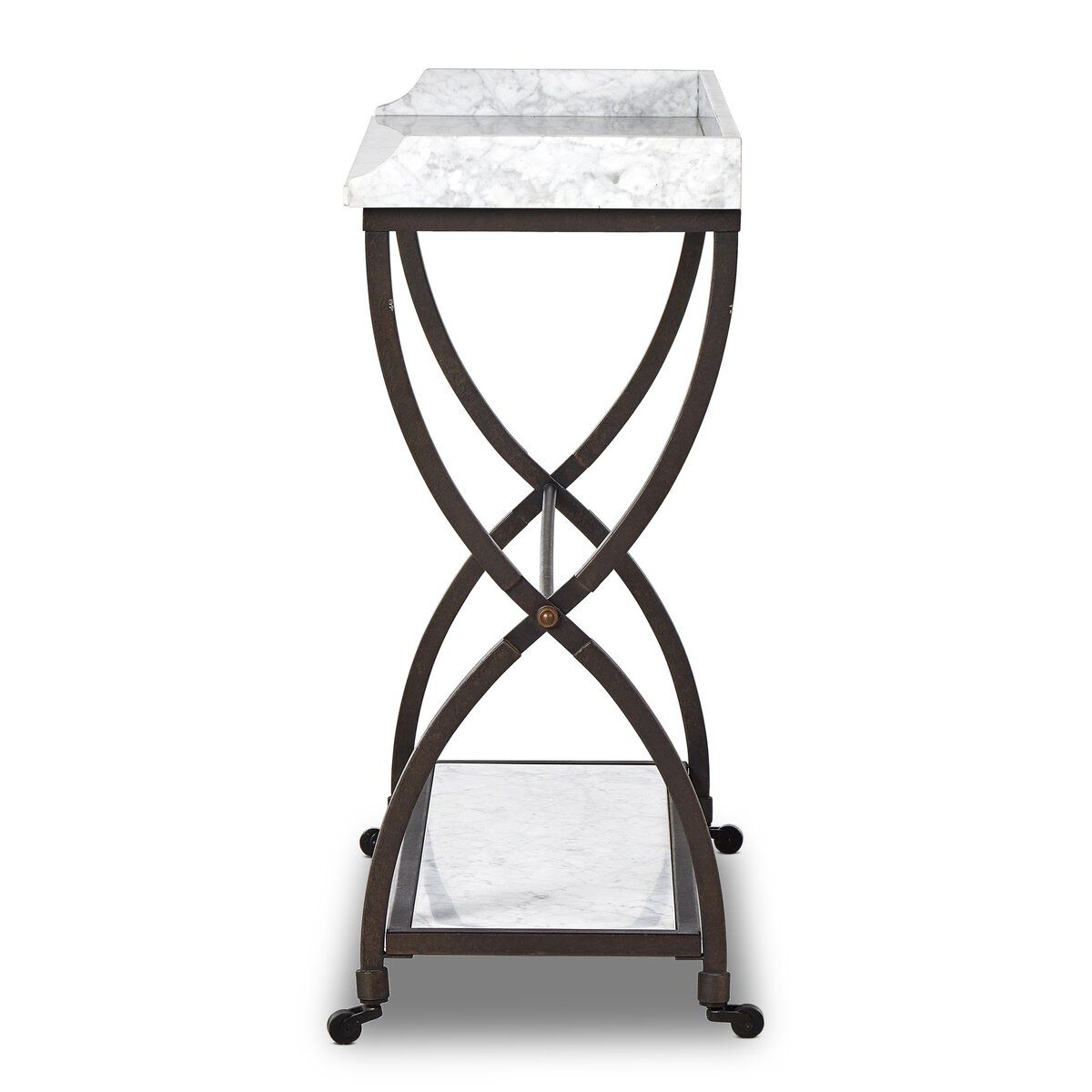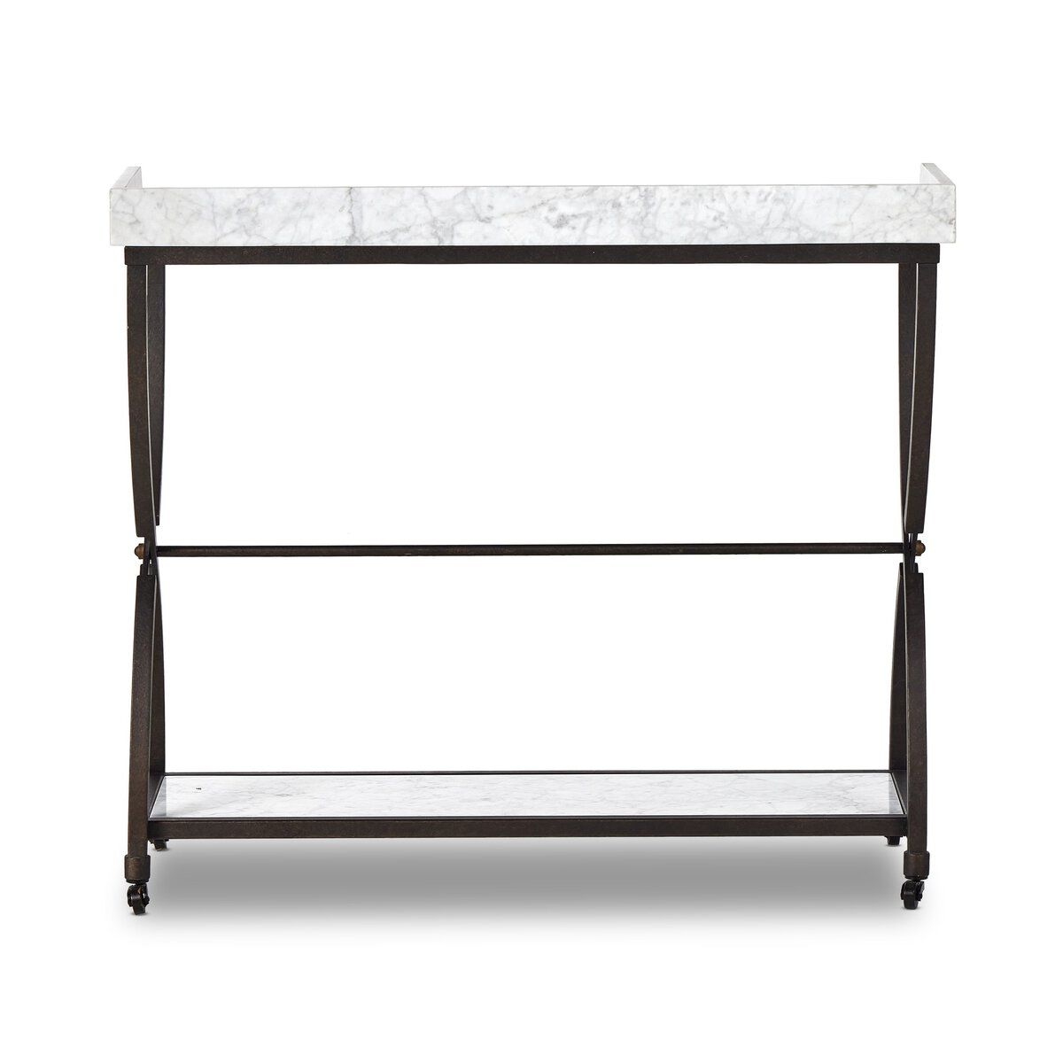 Solid travertine shelves introduce timeless materiality and subtle variation, ensuring each piece feels distinctive. Decorative casters complete the design with an unexpected, playful detail, allowing the table to feel both refined and functional within a variety of spaces.